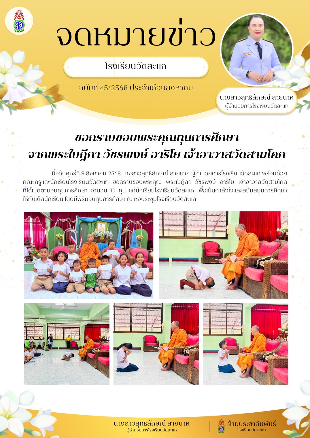 ขอกราบขอบพระคุณ พระใบฎีกา วัชรพงษ์ อาริโย เจ้าอาวาสวัดสามโคก ที่ได้เมตตามอบทุนการศึกษา จำนวน 10 ทุน แก่นักเรียนโรงเรียนวัดสะแก เพื่อเป็นกำลังใจและสนับสนุนการศึกษา