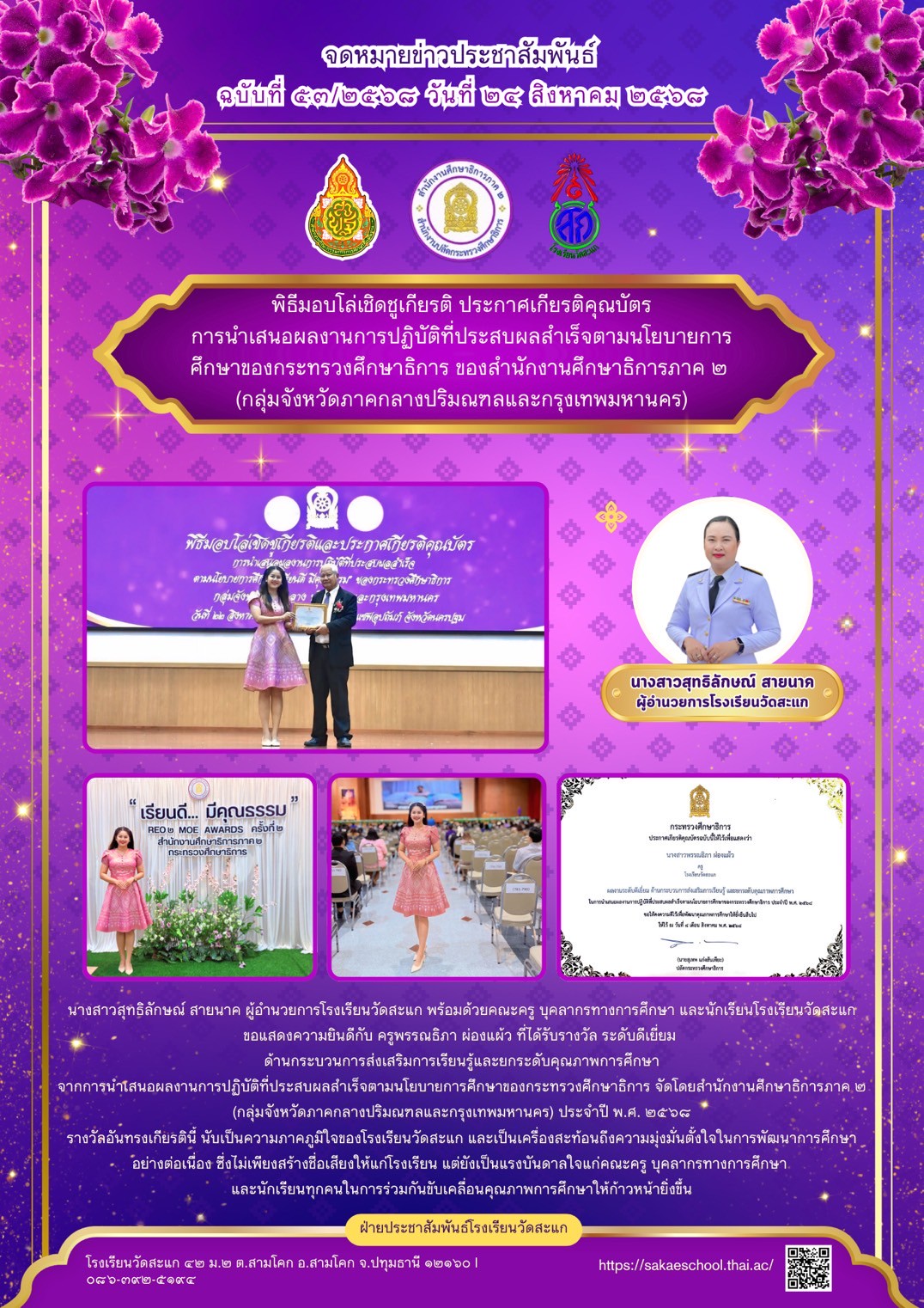 ขอแสดงความยินดีกับ ครูพรรณธิภา ผ่องแผ้ว ที่ได้รับรางวัล ระดับดีเยี่ยม ด้านกระบวนการส่งเสริมการเรียนรู้และยกระดับคุณภาพการศึกษา จากการนำเสนอผลงานการปฏิบัติที่ประสบผลสำเร็จตามนโยบายการศึกษาของกระทรวงศึก
