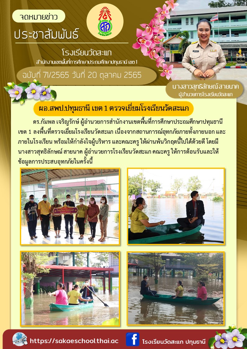 วันที่ 20 ตุลาคม 2565 ดร.กัมพล เจริญรักษ์ ผู้อำนวยการสำนักงานเขตพื้นที่การศึกษาประถมศึกษาปทุมธานี เขต 1 ลงพื้นที่ตรวจเยี่ยมโรงเรียนวัดสะแก เนื่องจากสถานการณ์อุทกภัยภายทั้งภายนอก และภายในโรงเรียน พร้อมให้กำลังใจผู้บริหาร และคณะครู ให้ผ่านพ้นวิกฤตนี้ไปได้ด้วยดี โดยมี นางสาวสุทธิลักษณ์ สายนาค ผู้อำนวยการโรงเรียนวัดสะแก คณะครู ให้การต้อนรับและให้ข้อมูลการประสบอุทกภัยในครั้งนี้