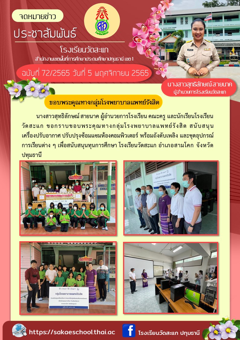 วันที่ 5 พฤศจิกายน 2565 นางสาวสุทธิลักษณ์ สายนาค ผู้อำนวยการโรงเรียน คณะครู และนักเรียนโรงเรียนวัดสะแก ขอกราบขอบพระคุณทางกลุ่มโรงพยาบาลแพทย์รังสิต สนับสนุนเครื่องปรับอากาศ ปรับปรุงซ้อมแซมห้องคอมพิวเตอร์ พร้อมถังดับเพลิง และชุดอุปกรณ์การเรียนต่าง ๆ เพื่อสนับสนุนทุนการศึกษา โรงเรียนวัดสะแก อำเภอสามโคก จังหวัดปทุมธานี