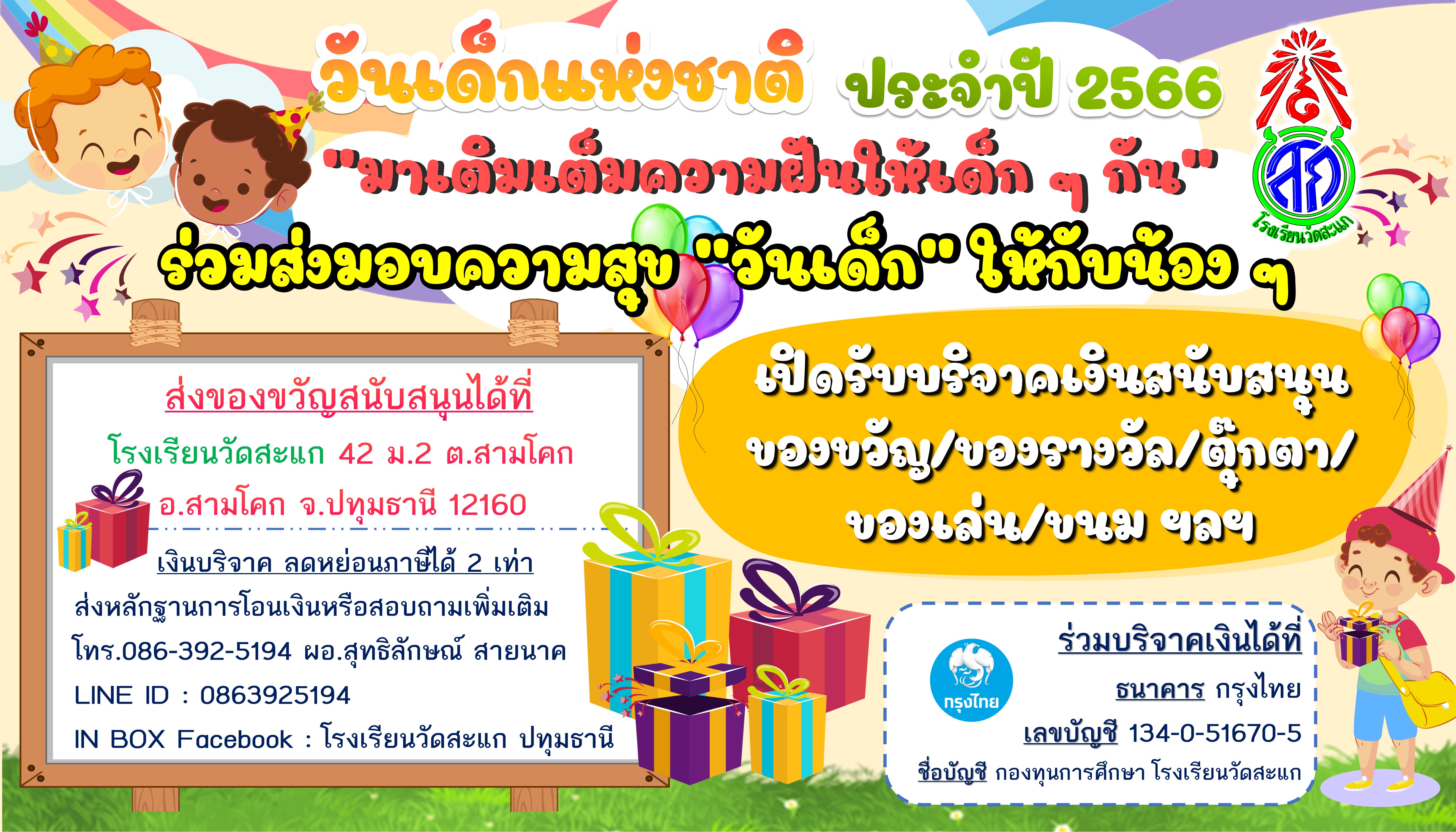 #ส่งของขวัญสนับสนุนได้ที่ โรงเรียนวัดสะแก 42 ม.2 ต.สามโคก อ.สามโคก จ.ปทุมธานี 12160