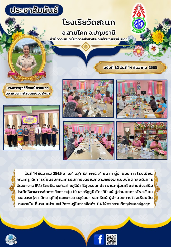 วันที่ 14 ธันวาคม 2565 นางสาวสุทธิลักษณ์ สายนาค ผู้อำนวยการโรงเรียน คณะครู ให้การต้อนรับคณะกรรมการเตรียมความพร้อม แบบข้อตกลงในการพัฒนางาน (PA) โดยมีนางสาวสายสุนีย์ ศรีสุวรรณ ประธานกลุ่มเครือข่ายส่งเสริมประสิทธิภาพการจัดการศึกษา กลุ่ม 10 นายรัฐภูมิ ฉัตรวิโรจน์ ผู้อำนวยการโรงเรียนคลองสระ (สภาวิทยาอุทิศ) และนางสาวสุรัตยา รอดรัตน์ ผู้อำนวยการโรงเรียนวัดบางเตยใน ที่มาแนะนำและให้ความรู้ในการจัดทำ PA ให้ตรงตามวัตถุประสงค์สูงสุด