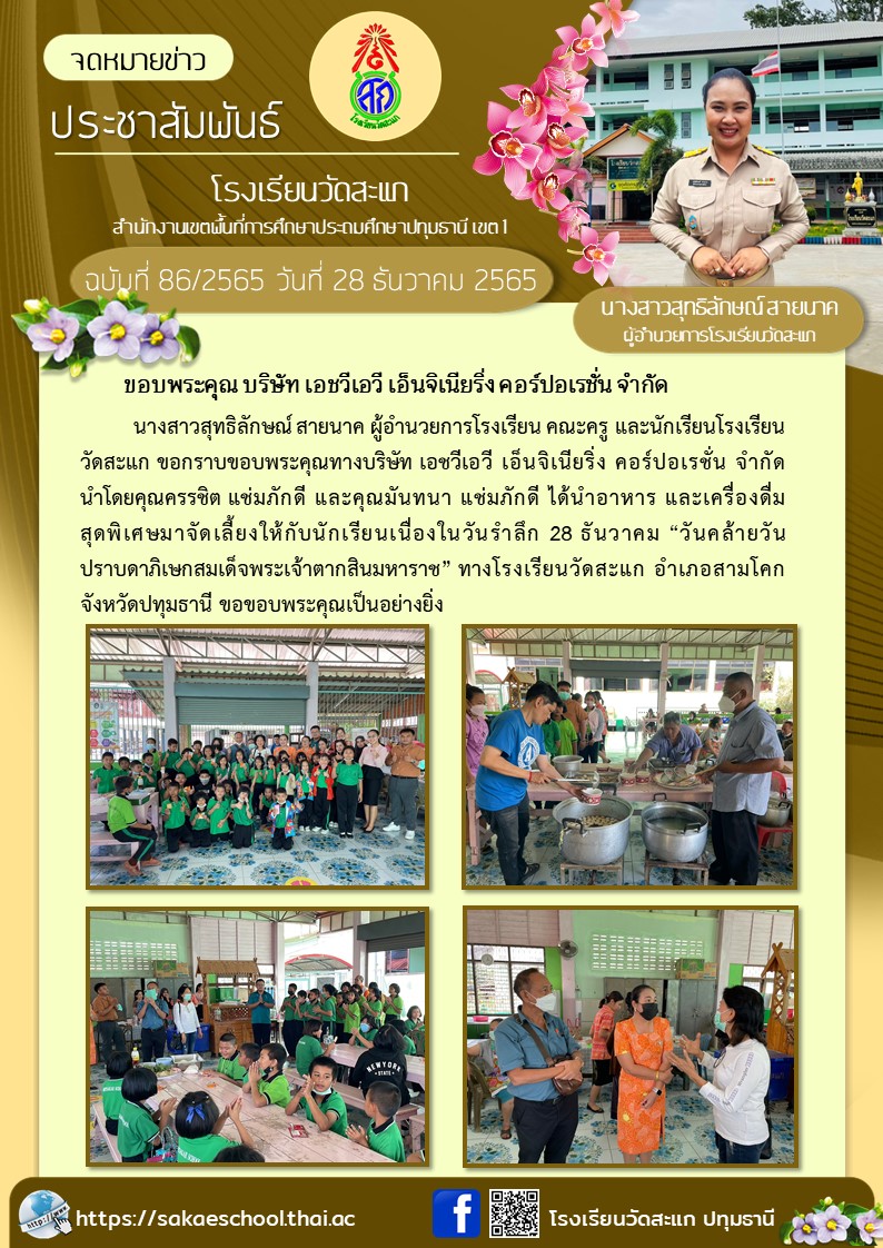 นางสาวสุทธิลักษณ์ สายนาค ผู้อำนวยการโรงเรียน คณะครู และนักเรียนโรงเรียนวัดสะแก ขอกราบขอบพระคุณทางบริษัท เอชวีเอวี เอ็นจิเนียริ่ง คอร์ปอเรชั่น จำกัด นำโดยคุณครรชิต แช่มภักดี และคุณมันทนา แช่มภักดี ได้นำอาหาร และเครื่องดื่ม สุดพิเศษมาจัดเลี้ยงให้กับนักเรียนเนื่องในวันรำลึก 28 ธันวาคม “วันคล้ายวันปราบดาภิเษกสมเด็จพระเจ้าตากสินมหาราช” ทางโรงเรียนวัดสะแก อำเภอสามโคก จังหวัดปทุมธานี ขอขอบพระคุณเป็นอย่างยิ่ง