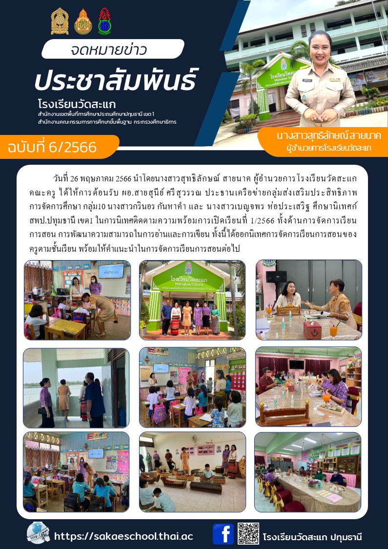 วันที่ 26 พฤษภาคม 2566 นำโดยนางสาวสุทธิลักษณ์ สายนาค ผู้อำนวยการโรงเรียนวัดสะแก คณะครู ได้ให้การต้อนรับ ผอ.สายสุนีย์ ศรีสุวรรณ ประธานเครือข่ายกลุ่มส่งเสริมประสิทธิภาพ           การจัดการศึกษา กลุ่ม10 นางสาวกรินอร กันหาคำ และ นางสาวเบญจพร ห่อประเสริฐ ศึกษานิเทศก์ สพป.ปทุมธานี เขต1 ในการนิเทศติดตามความพร้อมการเปิดเรียนที่ 1/2566 ทั้งด้านการจัดการเรียนการสอน การพัฒนาความสามารถในการอ่านและการเขียน ทั้งนี้ได้ออกนิเทศการจัดการเรียนการสอนของครูตามชั้นเรียน พร้อมให้คำแนะนำในการจัดการเรียนการสอนต่อไป