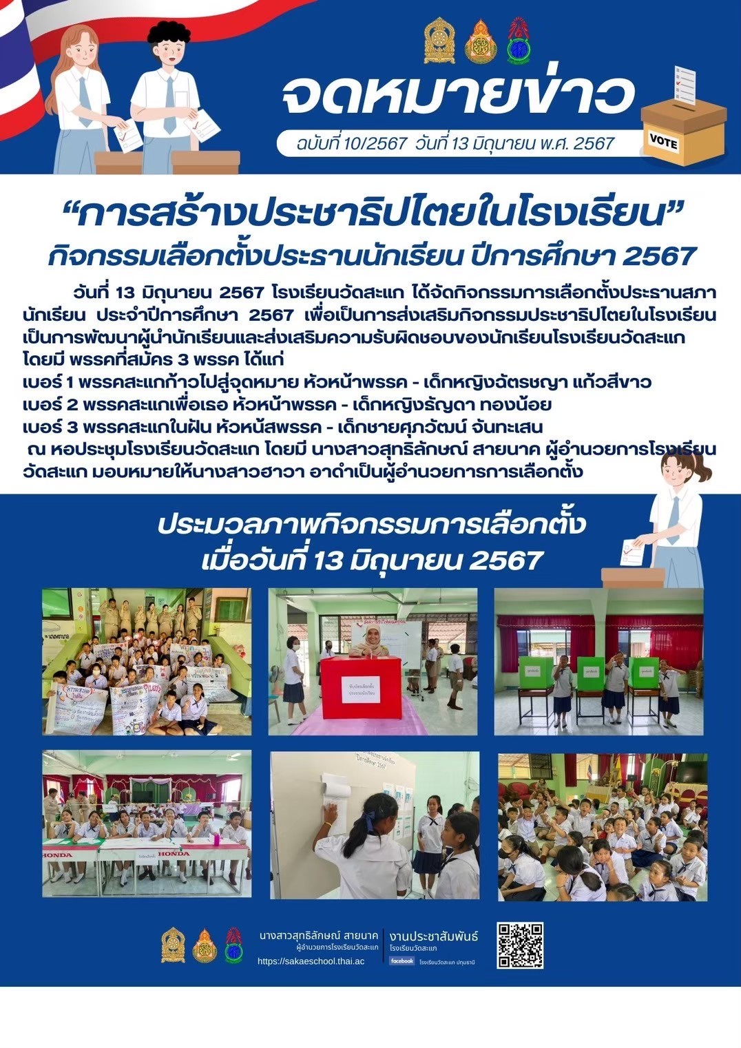 วันที่ 13 มิถุนายน 2567 โรงเรียนวัดสะแก ได้จัดกิจกรรมการเลือกตั้งประธานสภานักเรียน ประจำปีการศึกษา 2567 เพื่อเป็นการส่งเสริมกิจกรรมประชาธิปไตยในโรงเรียน เป็นการพัฒนาผู้นำนักเรียนและส่งเสริมความรับผิดชอบของนักเรียนโรงเรียนวัดสะแก โดยมี พรรคที่สมัคร 3 พรรค ได้แก่