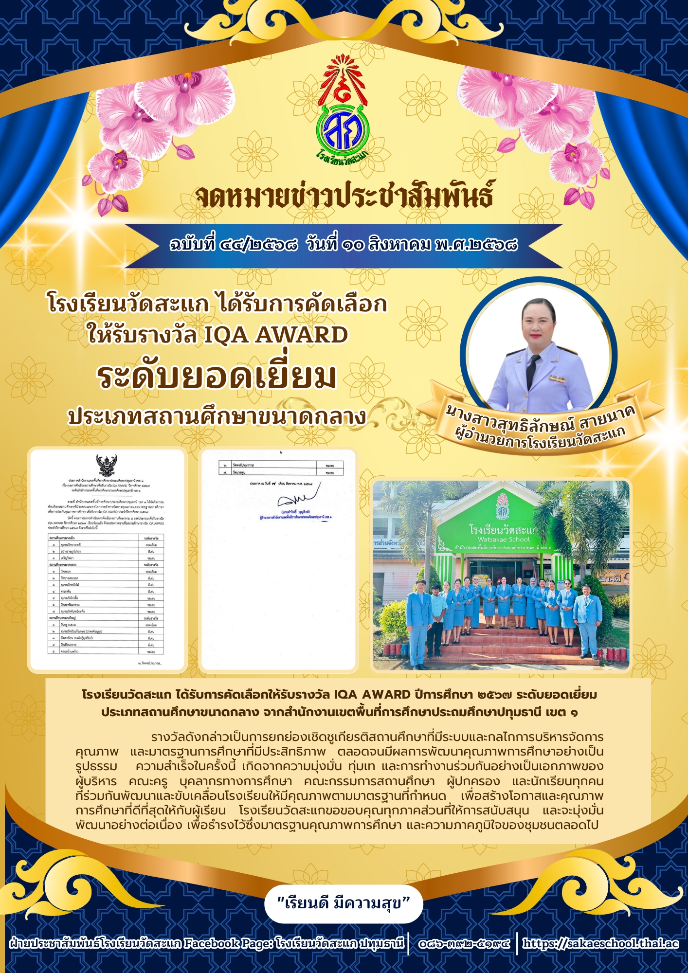 โรงเรียนวัดสะแก ได้รับรางวัล IQA AWARD ระดับยอดเยี่ยม ประเภทสถานศึกษาขนาดกลาง ปีการศึกษา 2567