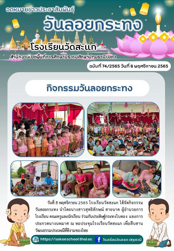 วันที่ 8 พฤศจิกายน 2565 โรงเรียนวัดสะแก ได้จัดกิจกรรมวันลอยกระทง นำโดยนางสาวสุทธิลักษณ์ สายนาค ผู้อำนวยการโรงเรียน คณะครูและนักเรียน ร่วมกันประดิษฐ์กระทงใบตอง และการประกวดนางนพมาศ ณ หอประชุมโรงเรียนวัดสะแก เพื่อสืบสานวัฒนธรรมประเพณีที่ดีงามของไทย
