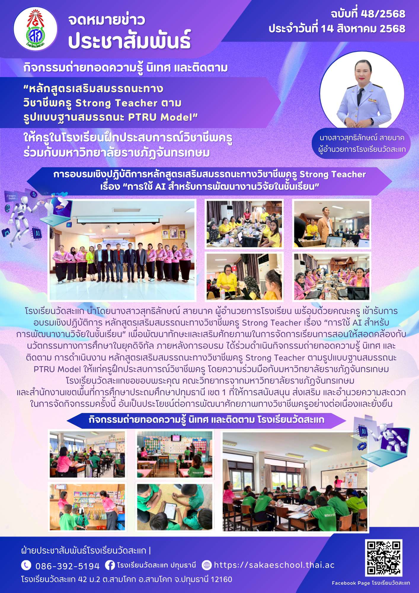 โรงเรียนวัดสะแก นำโดยนางสาวสุทธิลักษณ์ สายนาค ผู้อำนวยการโรงเรียน พร้อมด้วยคณะครู เข้ารับการอบรมเชิงปฏิบัติการ หลักสูตรเสริมสมรรถนะทางวิชาชีพครู Strong Teacher เรื่อง “การใช้ AI สำหรับการพัฒนางานวิจัยในชั้นเรียน” เพื่อพัฒนาทักษะและเสริมศักยภาพในการจัดการเรียนการสอนให้สอดคล้องกับนวัตกรรมทางการศึกษาในยุคดิจิทัล