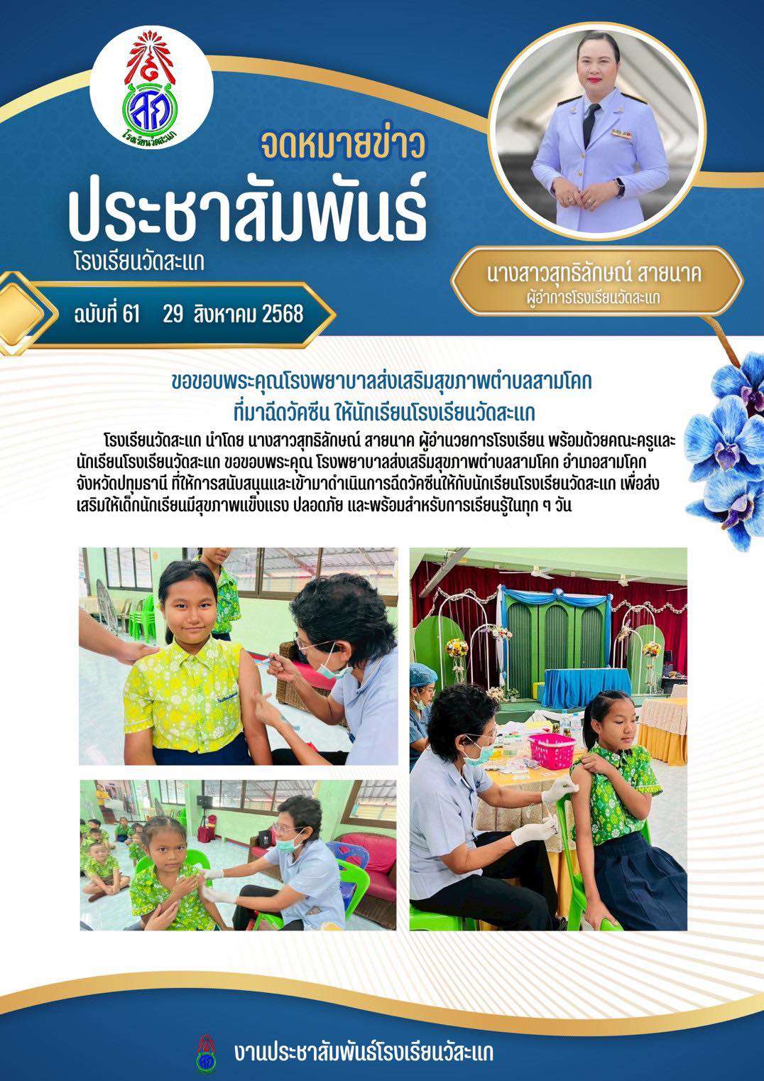 วันที่ 29 สิงหาคม 2568 โรงเรียนวัดสะแก นำโดย นางสาวสุทธิลักษณ์ สายนาค ผู้อำนวยการโรงเรียน พร้อมด้วยคณะครูและนักเรียนโรงเรียนวัดสะแก ขอขอบพระคุณ โรงพยาบาลส่งเสริมสุขภาพตำบลสามโคก อำเภอสามโคก จังหวัดปทุมธานี ที่ให้การสนับสนุนและเข้ามาดำเนินการฉีดวัคซีนให้กับนักเรียนโรงเรียนวัดสะแก เพื่อส่งเสริมให้เด็กนักเรียนมีสุขภาพแข็งแรง ปลอดภัย และพร้อมสำหรับการเรียนรู้ในทุก ๆ วัน