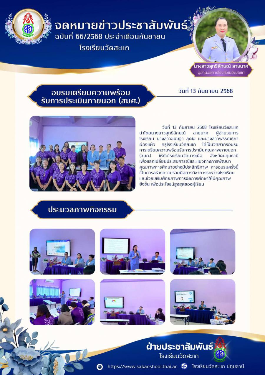 วันที่ 13 กันยายน 2568 โรงเรียนวัดสะแก นำโดยนางสาวสุทธิลักษณ์ สายนาค ผู้อำนวยการโรงเรียน นางสาวขนิษฐา สุดใจ และนางสาวพรรณธิภา ผ่องแผ้ว ครูโรงเรียนวัดสะแก ได้เป็นวิทยากรอบรมการเตรียมความพร้อมรับการประเมินคุณภาพภายนอก (สมศ.) ให้กับโรงเรียนวัดบางเดื่อ จังหวัดปทุมธานี เพื่อแลกเปลี่ยนประสบการณ์และแนวทางการพัฒนาคุณภาพการศึกษาอย่างมีประสิทธิภาพ การอบรมครั้งนี้เป็นการสร้างความร่วมมือทางวิชาการระหว่างโรงเรียน และช่วยเสริมศักยภาพการจัดการศึกษาให้มีคุณภาพ ยิ่งขึ้น เพื่อประโยชน์สูงสุดของผู้เรียน