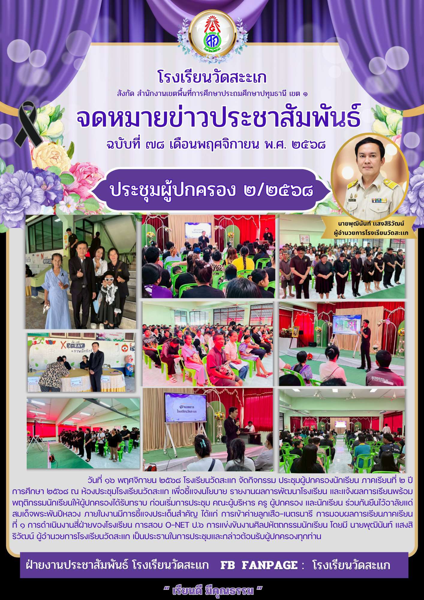 โรงเรียนวัดสะแก จัดกิจกรรม ประชุมผู้ปกครองนักเรียน ภาคเรียนที่ 2 ปีการศึกษา 2568 ณ หอประชุมโรงเรียนวัดสะแก เพื่อชี้แจงนโยบายของโรงเรียน
