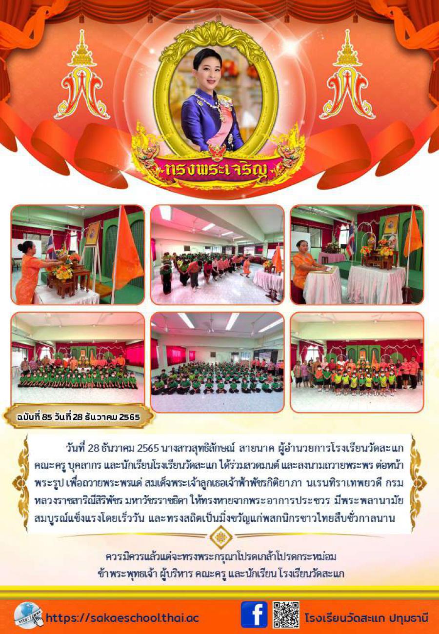 วันที่ 28 ธันวาคม 2565 นางสาวสุทธิลักษณ์  สายนาค ผู้อำนวยการโรงเรียนวัดสะแก คณะครู บุคลากร และนักเรียนโรงเรียนวัดสะแก ได้ร่วมสวดมนต์ และลงนามถวายพระพร ต่อหน้าพระรูป เพื่อถวายพระพรแด่ สมเด็จพระเจ้าลูกเธอเจ้าฟ้าพัชรกิติยาภา นเรนทิราเทพยวดี กรมหลวงราชสาริณีสิริพัชร มหาวัชรราชธิดา ให้ทรงหายจากพระอาการประชวร มีพระพลานามัยสมบูรณ์แข็งแรงโดยเร็ววัน และทรงสถิตเป็นมิ่งขวัญแก่พสกนิกรชาวไทยสืบชั่วกาลนาน