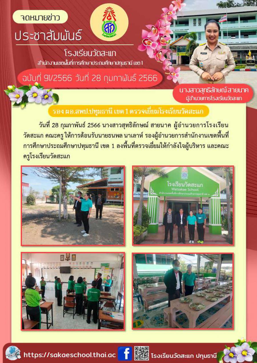 วันที่ 28 กุมภาพันธ์ 2566 นางสาวสุทธิลักษณ์ สายนาค ผู้อำนวยการโรงเรียน   วัดสะแก คณะครู ให้การต้อนรับนายธนพล นาเลาห์ รองผู้อำนวยการสำนักงานเขตพื้นที่การศึกษาประถมศึกษาปทุมธานี เขต 1 ลงพื้นที่ตรวจเยี่ยมให้กำลังใจผู้บริหาร และคณะครูโรงเรียนวัดสะแก