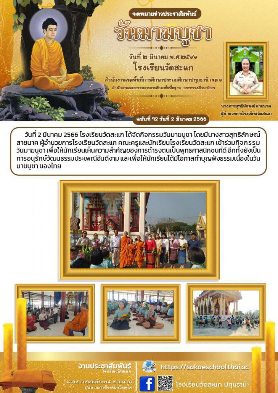 วันที่ 2 มีนาคม 2566 โรงเรียนวัดสะแก ได้จัดกิจกรรมวันมาฆบูชา โดยมีนางสาวสุทธิลักษณ์ สายนาค ผู้อำนวยการโรงเรียนวัดสะแก คณะครูและนักเรียนโรงเรียนวัดสะแก เข้าร่วมกิจกรรม  วันมาฆบูชา เพื่อให้นักเรียนเห็นความสำคัญของการดำรงตนเป็นพุทธศาสนิกชนที่ดี อีกทั้งยังเป็นการอนุรักษ์วัฒนธรรมประเพณีอันดีงาม และเพื่อให้นักเรียนได้มีโอกาสทำบุญฟังธรรมเนื่องในวันมาฆบูชา ของไทย