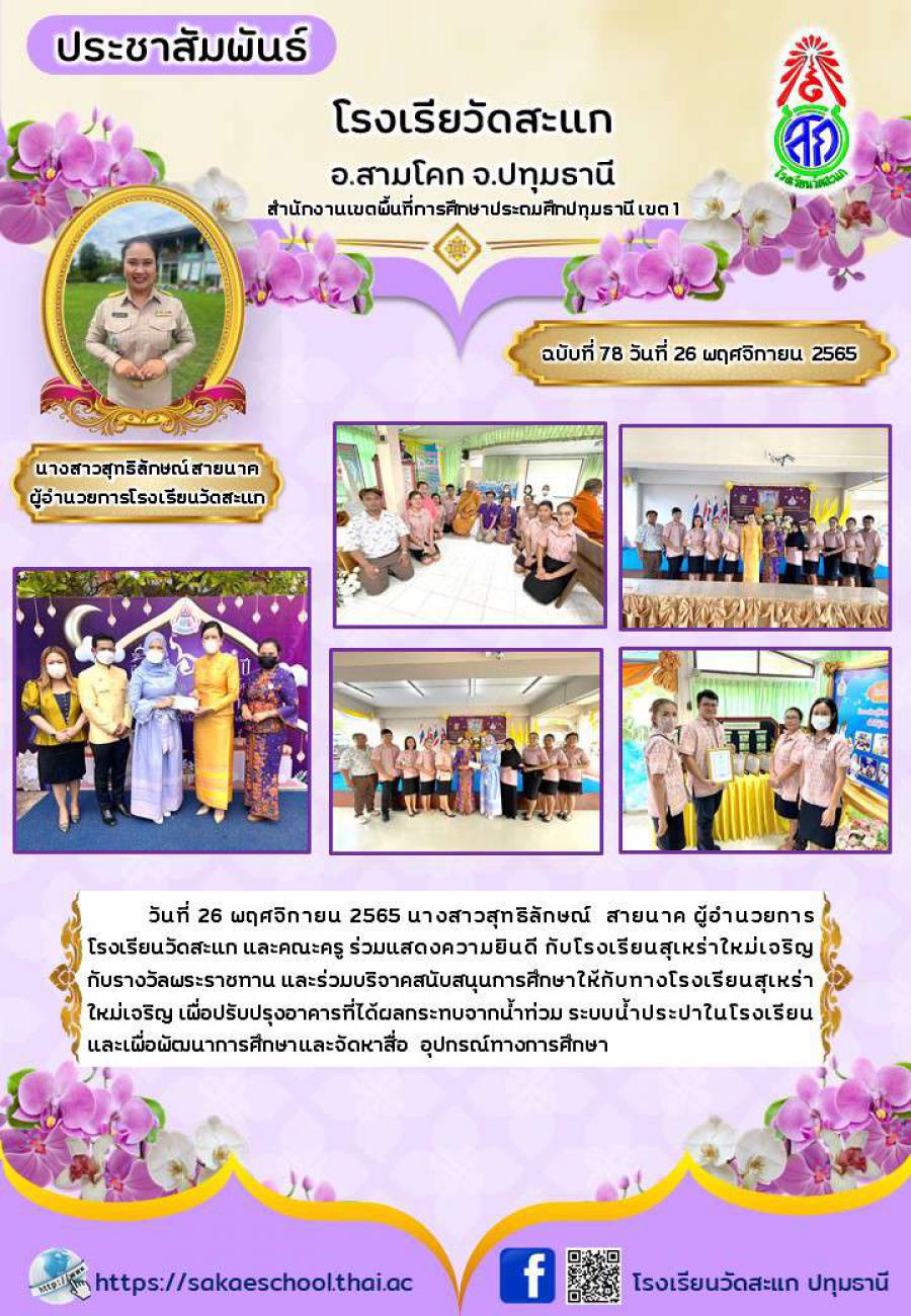 วันที่ 26 พฤศจิกายน 2565 นางสาวสุทธิลักษณ์  สายนาค ผู้อำนวยการโรงเรียนวัดสะแก และคณะครู ร่วมแสดงความยินดี กับโรงเรียนสุเหร่าใหม่เจริญ กับรางวัลพระราชทาน และร่วมบริจาคสนับสนุนการศึกษาให้กับทางโรงเรียนสุเหร่าใหม่เจริญ เพื่อปรับปรุงอาคารที่ได้ผลกระทบจากน้ำท่วม ระบบน้ำประปาในโรงเรียน และเพื่อพัฒนาการศึกษาและจัดหาสื่อ อุปกรณ์ทางการศึกษา