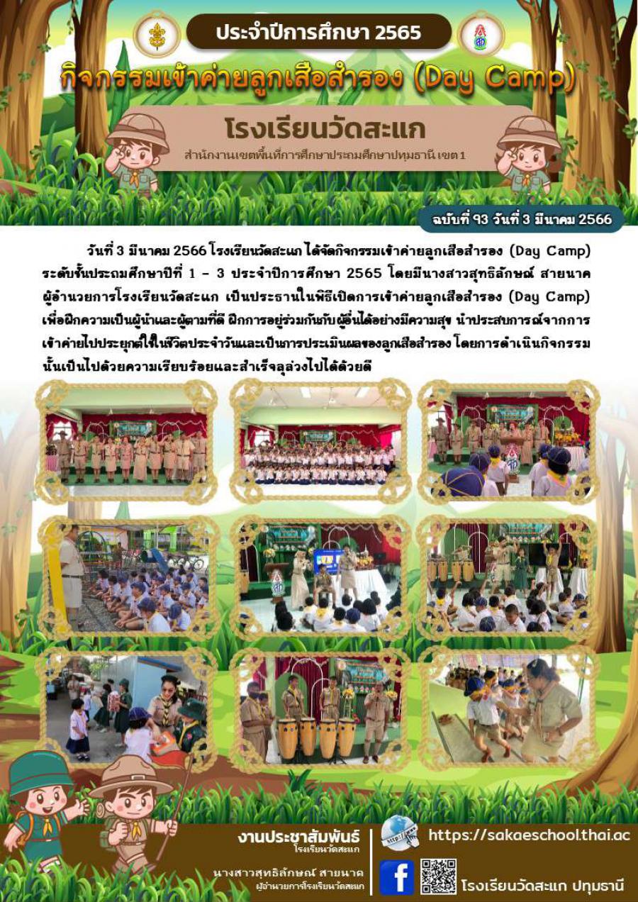 วันที่ 3 มีนาคม 2566 โรงเรียนวัดสะแก ได้จัดกิจกรรมเข้าค่ายลูกเสือสำรอง (Day Camp) ระดับชั้นประถมศึกษาปีที่ 1 - 3 ประจำปีการศึกษา 2565 โดยมีนางสาวสุทธิลักษณ์ สายนาค ผู้อำนวยการโรงเรียนวัดสะแก เป็นประธานในพิธีเปิดการเข้าค่ายลูกเสือสำรอง (Day Camp) เพื่อฝึกความเป็นผู้นำและผู้ตามที่ดี ฝึกการอยู่ร่วมกันกับผู้อื่นได้อย่างมีความสุข นำประสบการณ์จากการเข้าค่ายไปประยุกต์ใช้ในชีวิตประจำวันและเป็นการประเมินผลของลูกเสือสำรอง โดยการดำเนินกิจกรรมนั้นเป็นไปด้วยความเรียบร้อยและสำเร็จลุล่วงไปได้ด้วยดี