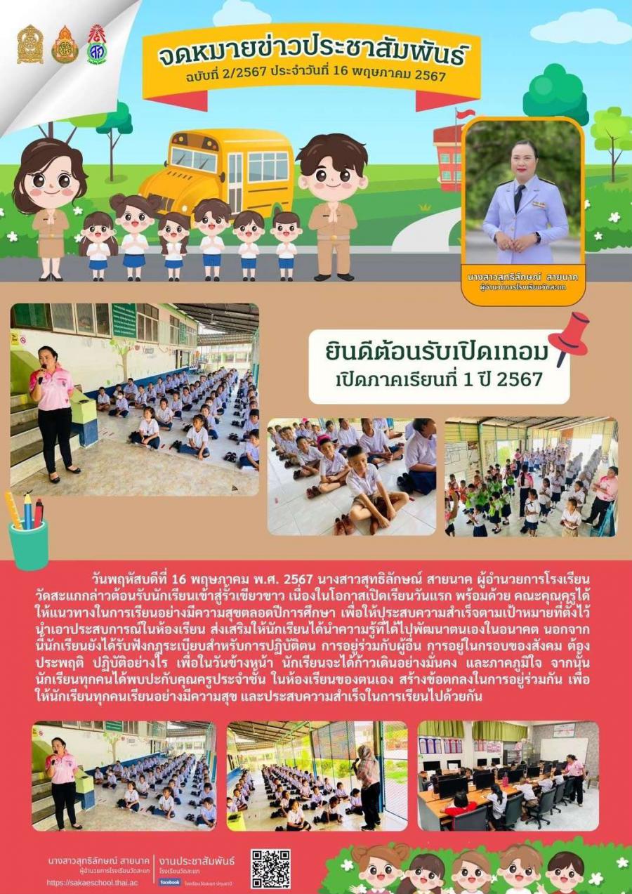 วันพฤหัสบดีที่ 16 พฤษภาคม พ.ศ. 2567 นางสาวสุทธิลักษณ์ สายนาค ผู้อำนวยการโรงเรียน วัดสะแกกล่าวต้อนรับนักเรียนเข้าสู่รั้วเขียวขาว เนื่องในโอกาสเปิดเรียนวันแรก พร้อมด้วย คณะคุณครูได้ให้แนวทางในการเรียนอย่างมีความสุขตลอดปีการศึกษา เพื่อให้ประสบความสำเร็จตามเป้าหมายที่ตั้งไว้ นำเอาประสบการณ์ในห้องเรียน ส่งเสริมให้นักเรียนได้นำความรู้ที่ได้ไปพัฒนาตนเองในอนาคต นอกจากนี้นักเรียนยังได้รับฟังกฎระเบียบสำหรับการปฏิบัติตน การอยู่ร่วมกับผู้อื่น การอยู่ในกรอบของสังคม ต้องประพฤติ ปฏิบัติอย่างไร เพื่อในวันข้างหน้า นักเรียนจะได้ก้าวเดินอย่างมั่นคง และภาคภูมิใจ จากนั้นนักเรียนทุกคนได้พบปะกับคุณครูประจำชั้น ในห้องเรียนของตนเอง สร้างข้อตกลงในการอยู่ร่วมกัน เพื่อให้นักเรียนทุกคนเรียนอย่างมีความสุข และประสบความสำเร็จในการเรียนไปด้วยกัน