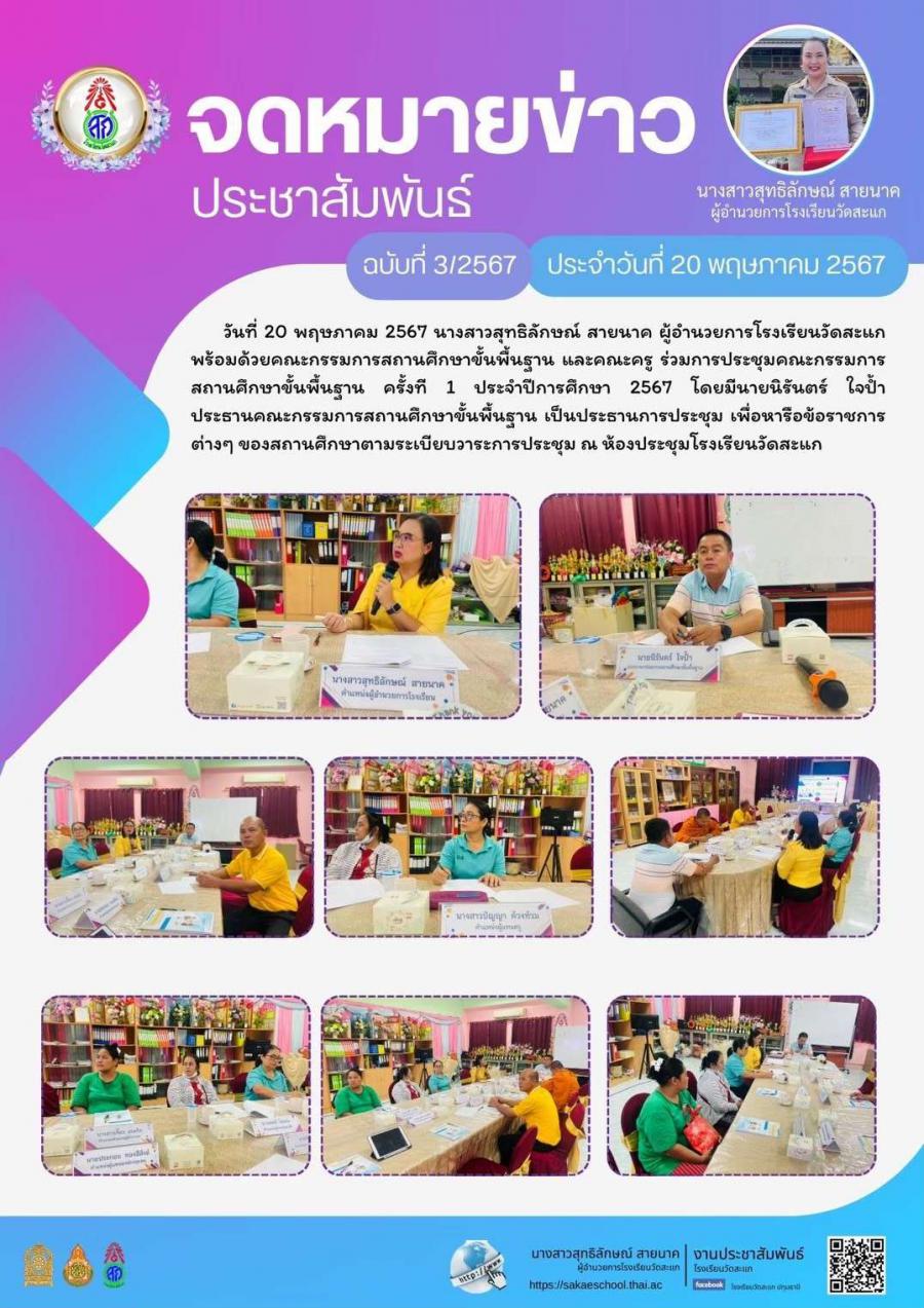 วันที่ 20 พฤษภาคม 2567 นางสาวสุทธิลักษณ์ สายนาค ผู้อำนวยการโรงเรียนวัดสะแก พร้อมด้วยคณะกรรมการสถานศึกษาขั้นพื้นฐาน และคณะครู ร่วมการประชุมคณะกรรมการสถานศึกษาขั้นพื้นฐาน ครั้งที 1 ประจำปีการศึกษา 2567 โดยมีนายนิรันตร์ ใจป้ำ ประธานคณะกรรมการสถานศึกษาขั้นพื้นฐาน เป็นประธานการประชุม เพื่อหารือข้อราชการต่างๆ ของสถานศึกษาตามระเบียบวาระการประชุม ณ ห้องประชุมโรงเรียนวัดสะแก