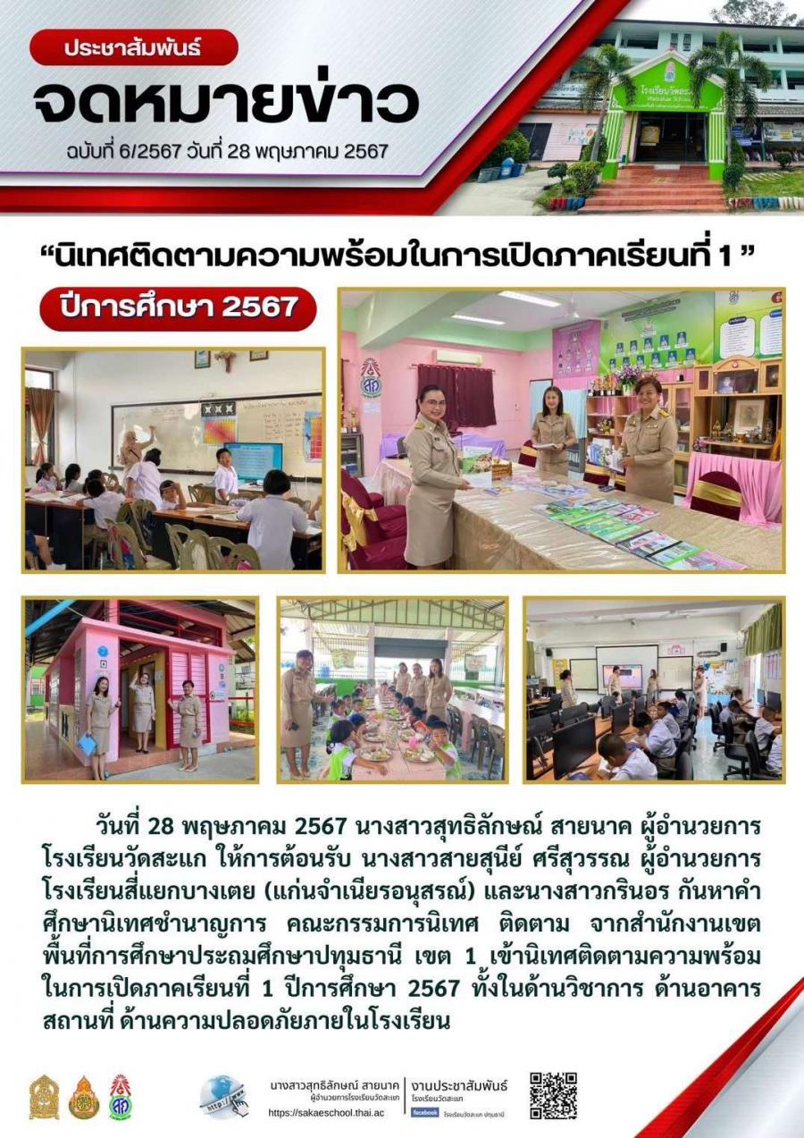 วันที่ 28 พฤษภาคม 2567 นางสาวสุทธิลักษณ์ สายนาค ผู้อำนวยการโรงเรียนวัดสะแก ให้การต้อนรับ นางสาวสายสุนีย์ ศรีสุวรรณ ผู้อำนวยการโรงเรียนสี่แยกบางเตย (แก่นจำเนียรอนุสรณ์) และนางสาวกรินอร กันหาคำ ศึกษานิเทศชำนาญการ คณะกรรมการนิเทศ ติดตาม จากสำนักงานเขตพื้นที่การศึกษาประถมศึกษาปทุมธานี เขต 1 เข้านิเทศติดตามความพร้อมในการเปิดภาคเรียนที่ 1 ปีการศึกษา 2567 ทั้งในด้านวิชาการ ด้านอาคารสถานที่ ด้านความปลอดภัยภายในโรงเรียน