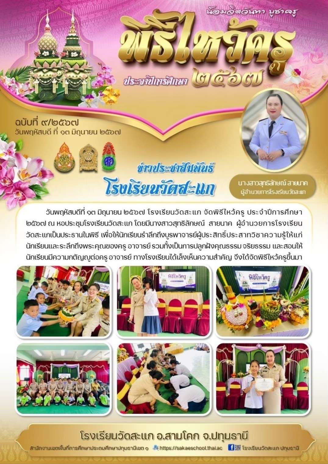 วันพฤหัสบดีที่ ๑๓ มิถุนายน ๒๕๖๗ โรงเรียนวัดสะแก จัดพิธีไหว้ครู ประจำปีการศึกษา ๒๕๖๗ ณ หอประชุมโรงเรียนวัดสะแก โดยมีนางสาวสุทธิลักษณ์  สายนาค  ผู้อำนวยการโรงเรียนวัดสะแกเป็นประธานในพิธี เพื่อให้นักเรียนรำลึกถึงบูรพาจารย์ผู้ประสิทธิ์ประสาทวิชาความรู้ให้แก่นักเรียนและระลึกถึงพระคุณของครู อาจารย์ รวมทั้งเป็นการปลูกฝังคุณธรรม จริยธรรม และสอนให้นักเรียนมีความกตัญญูต่อครู อาจารย์ ทางโรงเรียนได้เล็งเห็นความสำคัญ จึงได้จัดพิธีไหว้ครูขึ้นมา