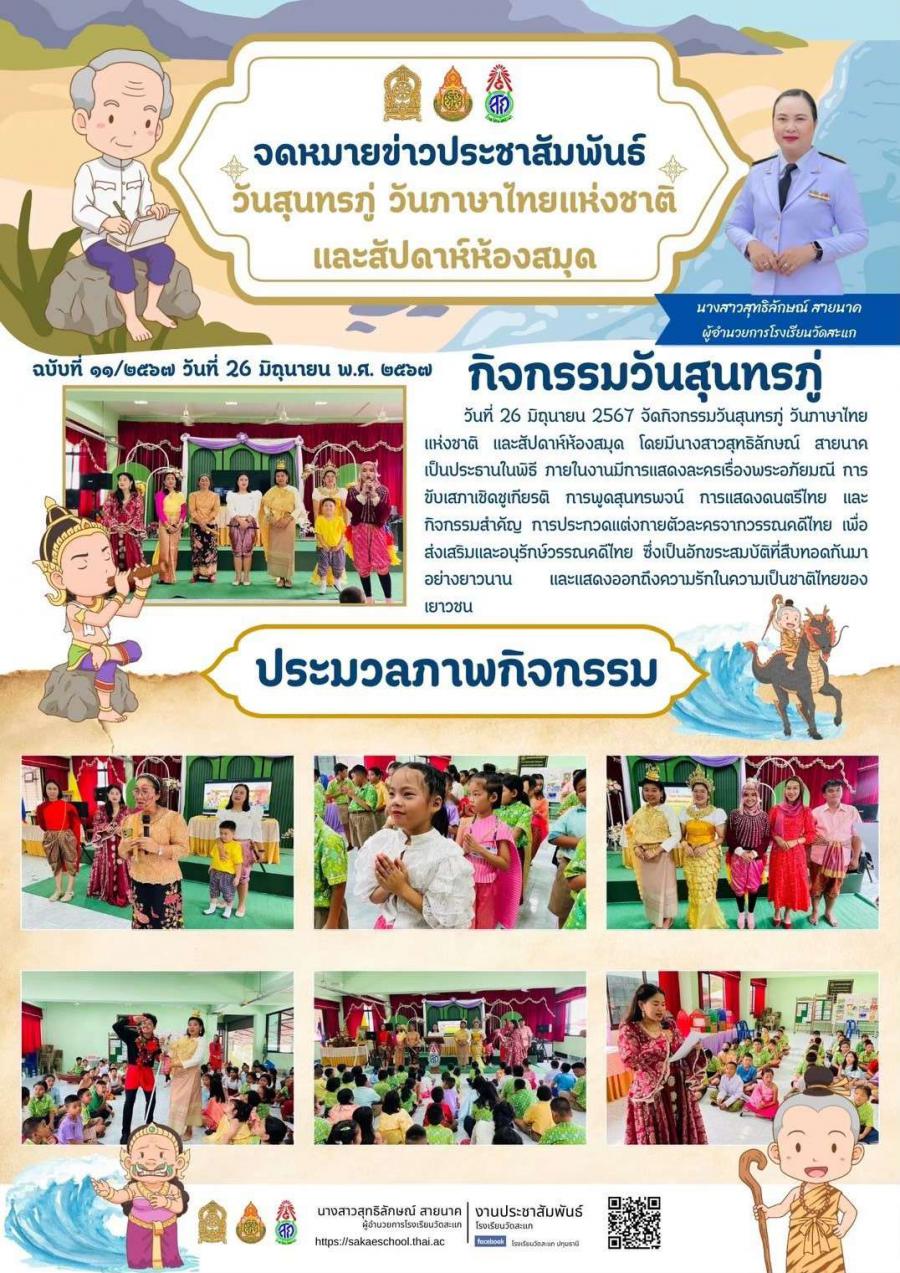 วันที่ 26 มิถุนายน 2567 จัดกิจกรรมวันสุนทรภู่ วันภาษาไทยแห่งชาติ และสัปดาห์ห้องสมุด โดยมีนางสาวสุทธิลักษณ์ สายนาค เป็นประธานในพิธี ภายในงานมีการแสดงละครเรื่องพระอภัยมณี การขับเสภาเชิดชูเกียรติ การพูดสุนทรพจน์ การแสดงดนตรีไทย และกิจกรรมสำคัญ การประกวดแต่งกายตัวละครจากวรรณคดีไทย เพื่อส่งเสริมและอนุรักษ์วรรณคดีไทย ซึ่งเป็นอักขระสมบัติที่สืบทอดกันมาอย่างยาวนาน และแสดงออกถึงความรักในความเป็นชาติไทยของเยาวชน