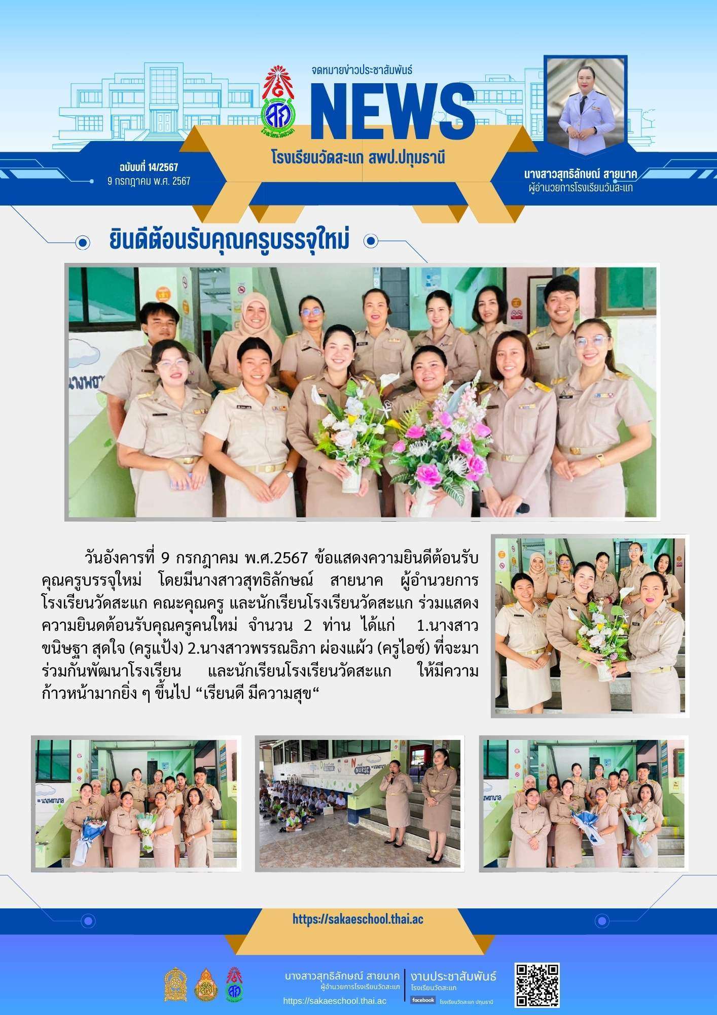 วันอังคารที่ 9 กรกฎาคม พ.ศ.2567 ข้อแสดงความยินดีต้อนรับคุณครูบรรจุใหม่ โดยมีนางสาวสุทธิลักษณ์ สายนาค ผู้อำนวยการโรงเรียนวัดสะแก คณะคุณครู และนักเรียนโรงเรียนวัดสะแก ร่วมแสดงความยินดต้อนรับคุณครูคนใหม่ จำนวน 2 ท่าน ได้แก่ 1.นางสาวขนิษฐา สุดใจ (ครูแป้ง) 2.นางสาวพรรณธิภา ผ่องแผ้ว (ครูไอซ์) ที่จะมาร่วมกันพัฒนาโรงเรียน และนักเรียนโรงเรียนวัดสะแก ให้มีความก้าวหน้ามากยิ่ง ๆ ขึ้นไป “เรียนดี มีความสุข“