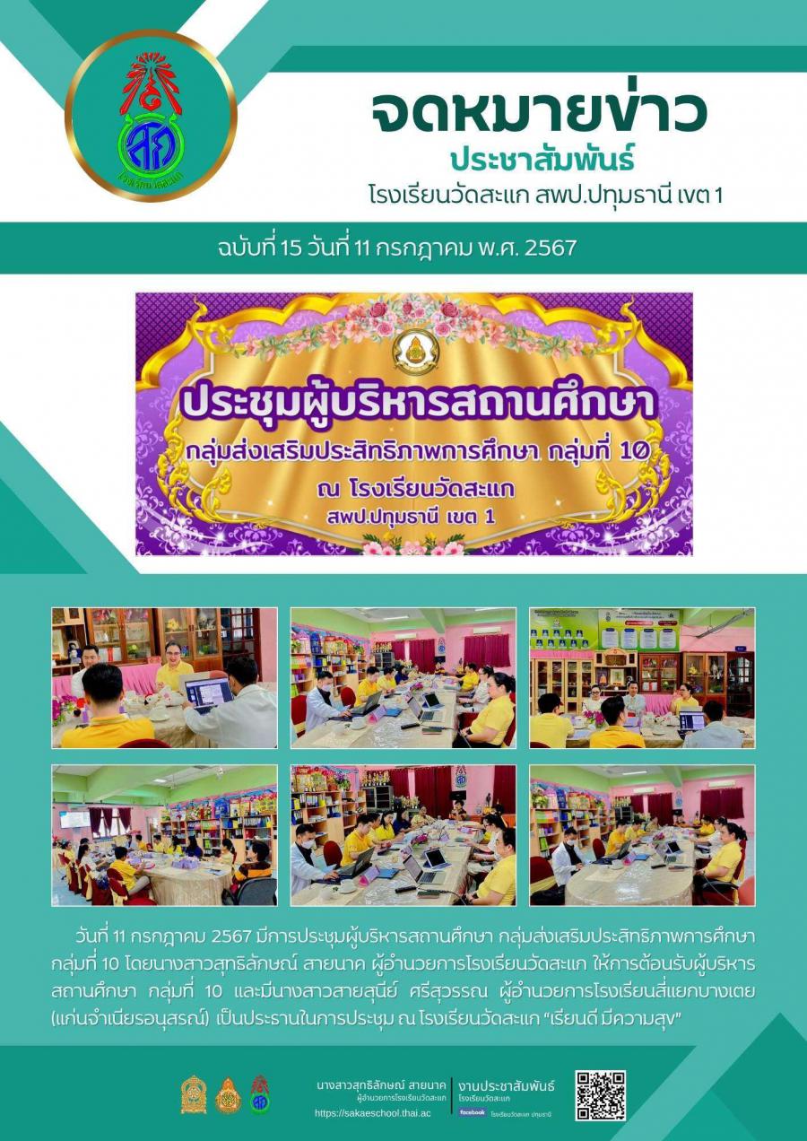 วันที่ 11 กรกฎาคม 2567 มีการประชุมผู้บริหารสถานศึกษา กลุ่มส่งเสริมประสิทธิภาพการศึกษา กลุ่มที่ 10 โดยนางสาวสุทธิลักษณ์ สายนาค ผู้อำนวยการโรงเรียนวัดสะแก ให้การต้อนรับผู้บริหารสถานศึกษา กลุ่มที่ 10 และมีนางสาวสายสุนีย์ ศรีสุวรรณ ผู้อำนวยการโรงเรียนสี่แยกบางเตย (แก่นจำเนียรอนุสรณ์) เป็นประธานในการประชุม ณ โรงเรียนวัดสะแก “เรียนดี มีความสุข”