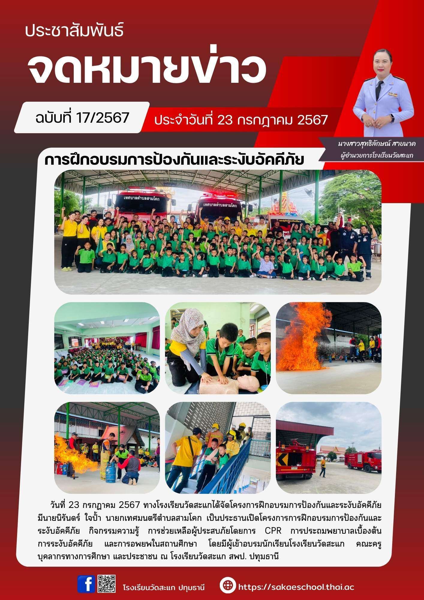 วันที่ 23 กรกฏาคม 2567 ทางโรงเรียนวัดสะแกได้จัดโครงการฝึกอบรมการป้องกันและระงับอัคคีภัย มีนายนิรันดร์ ใจป้ำ นายกเทศมนตรีตำบลสามโคก เป็นประธานเปิดโครงการการฝึกอบรมการป้องกันและระงับอัคคีภัย กิจกรรมความรู้ การช่วยเหลือผู้ประสบภัยโดยการ CPR การประถมพยาบาลเบื้องต้น การระงับอัคคีภัย และการอพยพในสถานศึกษา โดยมีผู้เข้าอบรมนักเรียนโรงเรียนวัดสะแก คณะครูบุคลากรทางการศึกษา และประชาชน ณ โรงเรียนวัดสะแก สพป. ปทุมธานี