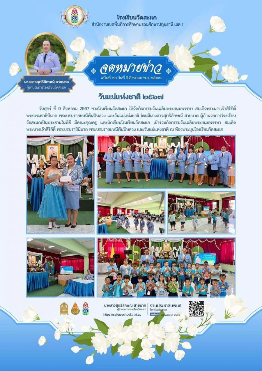 วันศุกร์ ที่ 9 สิงหาคม 2567 ทางโรงเรียนวัดสะแก ได้จัดกิจกรรมวันเฉลิมพระชนมพรรษา สมเด็จพระนางเจ้าสิริกิติ์ พระบรมราชินีนาถ พระบรมราชชนนีพันปีหลวง และวันแม่แห่งชาติ โดยมีนางสาวสุทธิลักษณ์ สายนาค ผู้อำนวยการโรงเรียนวัดสะแกเป็นประธานในพิธี มีคณะคุณครู และนักเรียนโรงเรียนวัดสะแก เข้าร่วมกิจกรรมวันเฉลิมพระชนมพรรษา สมเด็จพระนางเจ้าสิริกิติ์ พระบรมราชินีนาถ พระบรมราชชนนีพันปีหลวง และวันแม่แห่งชาติ ณ ห้องประชุมโรงเรียนวัดสะแก