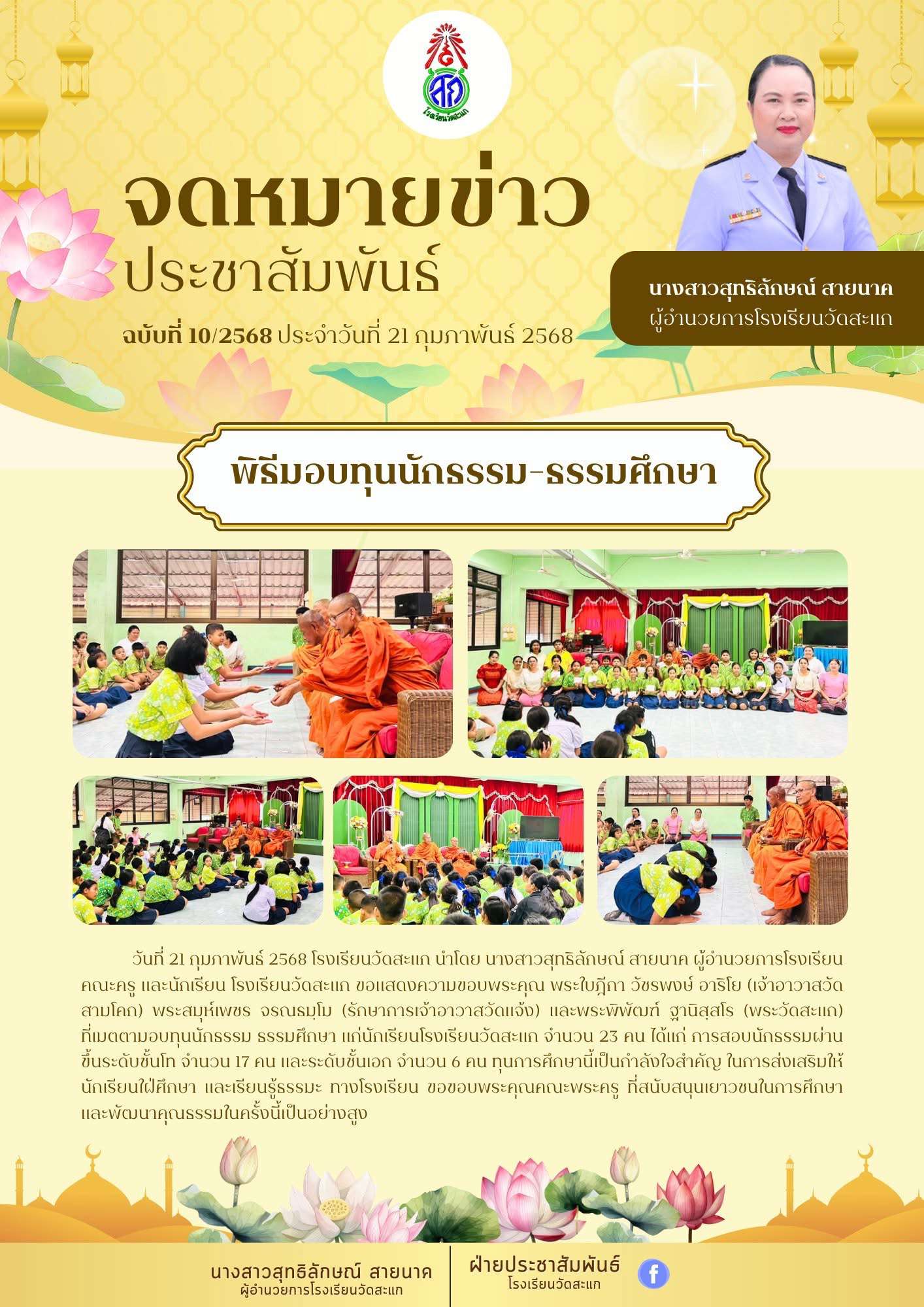 เมื่อวันที่ 21 กุมภาพันธ์ 2568 โรงเรียนวัดสะแก นำโดย นางสาวสุทธิลักษณ์ สายนาค ผู้อำนวยการโรงเรียน คณะครู และนักเรียน โรงเรียนวัดสะแก ขอแสดงความขอบพระคุณ พระใบฎีกา วัชรพงษ์ อาริโย (เจ้าอาวาสวัดสามโคก) พระสมุห์เพชร จรณธมฺโม (รักษาการเจ้าอาวาสวัดแจ้ง) และพระพิพัฒฑ์ ฐานิสฺสโร (พระวัดสะแก) ที่เมตตามอบทุนนักธรรม ธรรมศึกษา แก่นักเรียนโรงเรียนวัดสะแก จำนวน 23 คน ได้แก่ การสอบนักธรรมผ่านขึ้นระดับชั้นโท จำนวน 17 คน และระดับชั้นเอก จำนวน 6 คน ทุนการศึกษานี้เป็นกำลังใจสำคัญ ในการส่งเสริมให้นักเรียนใฝ่ศึกษา และเรียนรู้ธรรมะ ทางโรงเรียน ขอขอบพระคุณคณะพระครู ที่สนับสนุนเยาวชนในการศึกษา และพัฒนาคุณธรรมในครั้งนี้เป็นอย่างสูง