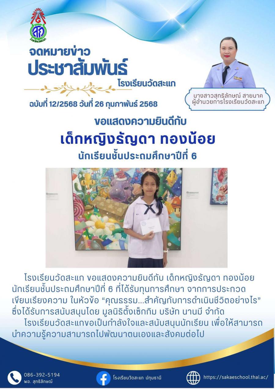 โรงเรียนวัดสะแก ขอแสดงความยินดีกับ เด็กหญิงธัญดา ทองน้อย นักเรียนชั้นประถมศึกษาปีที่ 6 ที่ได้รับทุนการศึกษา จากการประกวดเขียนเรียงความ ในหัวข้อ “คุณธรรม...สำคัญกับการดำเนินชีวิตอย่างไร” ซึ่งได้รับการสนับสนุนโดย มูลนิธิตั้งเซ็กกิม บริษัท นานมี จำกัด โรงเรียนวัดสะแกขอเป็นกำลังใจ และสนับสนุนนักเรียน เพื่อให้สามารถนำความรู้ความสามารถไปพัฒนาตนเองและสังคมต่อไป