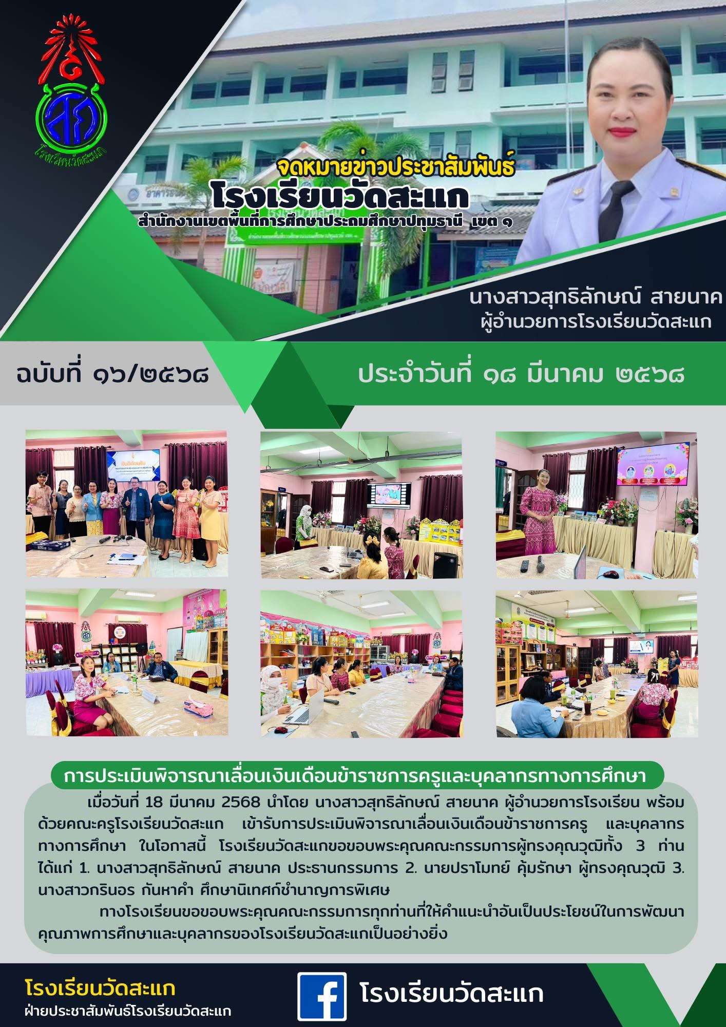 เมื่อวันที่ 18 มีนาคม 2568 นำโดย นางสาวสุทธิลักษณ์ สายนาค ผู้อำนวยการโรงเรียน พร้อมด้วยคณะครูโรงเรียนวัดสะแก เข้ารับการประเมินพิจารณาเลื่อนเงินเดือนข้าราชการครู และบุคลากรทางการศึกษา ในโอกาสนี้ โรงเรียนวัดสะแกขอขอบพระคุณคณะกรรมการผู้ทรงคุณวุฒิทั้ง 3 ท่าน ได้แก่ 1. นางสาวสุทธิลักษณ์ สายนาค ประธานกรรมการ 2. นายปราโมทย์ คุ้มรักษา ผู้ทรงคุณวุฒิ 3. นางสาวกรินอร กันหาคำ ศึกษานิเทศก์ชำนาญการพิเศษ