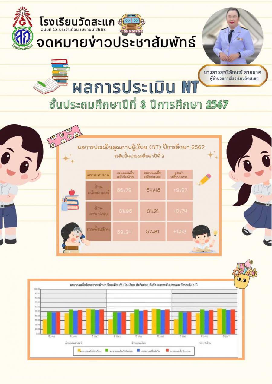 โรงเรียนวัดสะแก อำเภอสามโคก จังหวัดปทุมธานี ขอแจ้งผลการประเมินความสามารถด้านพื้นฐานของผู้เรียนระดับชาติ (NT) ชั้นประถมศึกษาปีที่ 3 ปีการศึกษา 2567 ซึ่งจัดโดยสถาบันทดสอบทางการศึกษาแห่งชาติ (องค์การมหาชน) พบว่า นักเรียนของโรงเรียนมีพัฒนาการด้านความสามารถพื้นฐานทั้งด้านภาษา คำนวณ และเหตุผล อยู่ในระดับที่น่าพอใจ สะท้อนถึงคุณภาพการเรียนการสอนที่มุ่งพัฒนาทักษะที่จำเป็นในศตวรรษที่ 21 โรงเรียนขอขอบคุณคณะครู ผู้ปกครอง และนักเรียนที่ร่วมกันส่งเสริมการเรียนรู้อย่างต่อเนื่อง และจะนำผลการประเมินไปใช้ในการพัฒนาการจัดการเรียนการสอนต่อไปอย่างมีประสิทธิภาพ