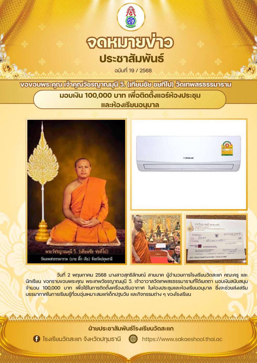 โรงเรียนวัดสะแก อำเภอสามโคก จังหวัดปทุมธานี ขอกราบขอบพระคุณ พระเดชพระคุณ พระราชวัชรญาณมุนี (วิ) เทียนชัย ชยทีโป ที่เมตตาสนับสนุนงบประมาณจำนวน 100,000 บาท เพื่อใช้ในการติดตั้งเครื่องปรับอากาศภายในหอประชุมและห้องเรียนระดับอนุบาล ส่งเสริมสภาพแวดล้อมที่เอื้อต่อการเรียนรู้ของนักเรียนอย่างยิ่ง โรงเรียนขออำนาจคุณพระศรีรัตนตรัยดลบันดาลให้ท่านมีสุขภาพแข็งแรง เจริญในธรรม และเป็นร่มโพธิ์ร่มไทรให้แก่ชุมชนและการศึกษาสืบไป