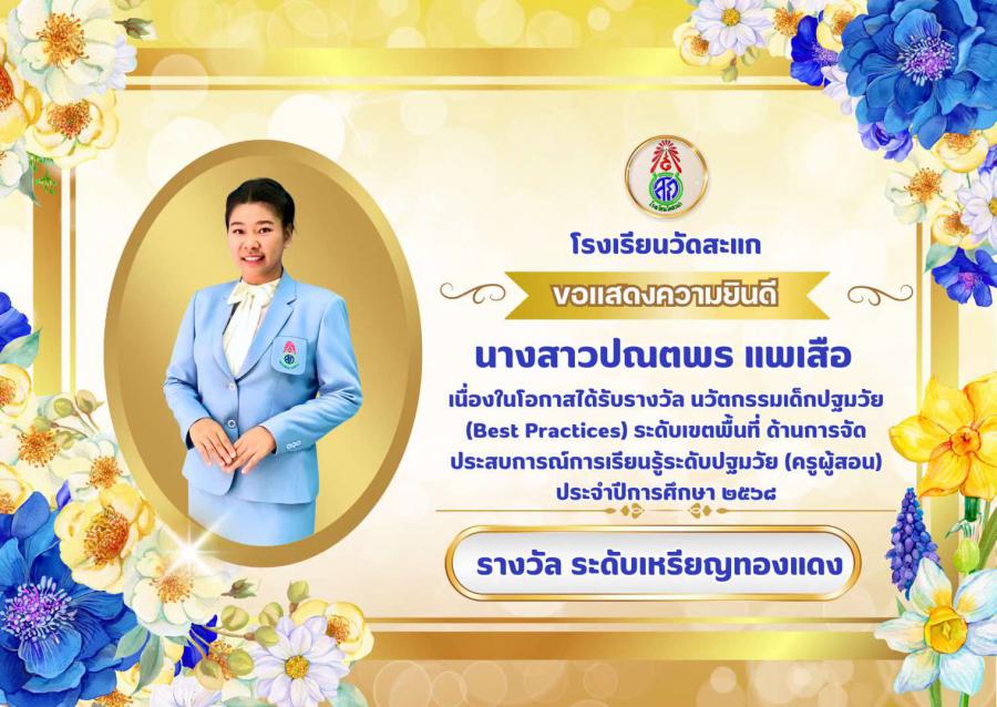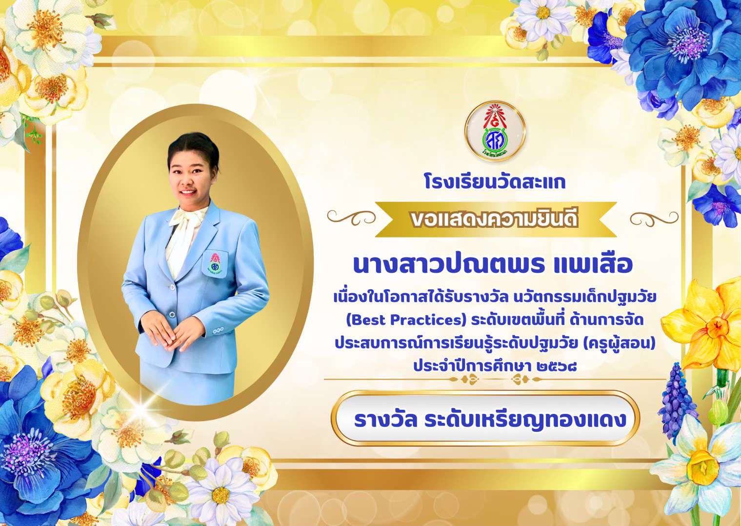 โรงเรียนวัดสะแก อำเภอสามโคก จังหวัดปทุมธานี ขอแสดงความยินดีกับ นางสาวปณตพร แพเสือ ในโอกาสที่ได้รับ รางวัลนวัตกรรมเด็กปฐมวัย (Best Practice) ระดับเขตพื้นที่การศึกษา ด้านการจัดประสบการณ์การเรียนรู้ระดับปฐมวัย (ครูผู้สอน) ประจำปีการศึกษา 2568 รางวัลระดับเหรียญทองแดง โรงเรียนขอชื่นชมในความตั้งใจและความสามารถในการจัดกิจกรรมการเรียนรู้อย่างสร้างสรรค์ และหวังเป็นอย่างยิ่งว่าจะพัฒนาศักยภาพต่อไปเพื่อประโยชน์ของนักเรียนในระดับปฐมวัย