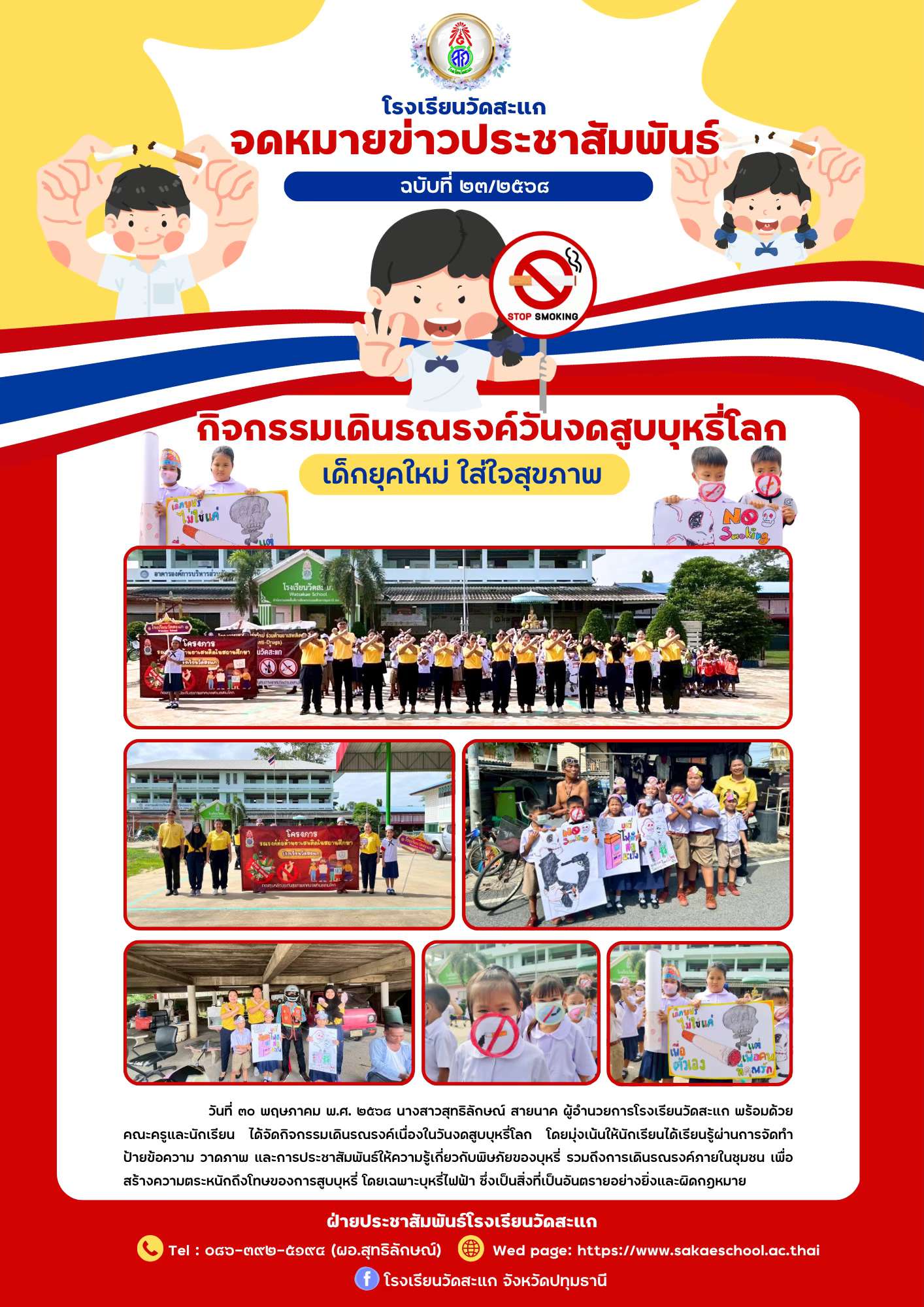 โรงเรียนวัดสะแก อำเภอสามโคก จังหวัดปทุมธานี ได้จัดกิจกรรม วันงดสูบบุหรี่โลก ประจำปี 2568 เพื่อส่งเสริมให้นักเรียนตระหนักถึงพิษภัยของการสูบบุหรี่และสารเสพติด โดยมีกิจกรรมให้ความรู้ การจัดนิทรรศการ และการรณรงค์ผ่านสื่อสร้างสรรค์ต่าง ๆ เพื่อสร้างค่านิยมในการดูแลสุขภาพตนเอง ห่างไกลบุหรี่และยาเสพติด ตลอดจนปลูกฝังพฤติกรรมสุขภาวะที่ดีให้กับนักเรียนในระยะยาว