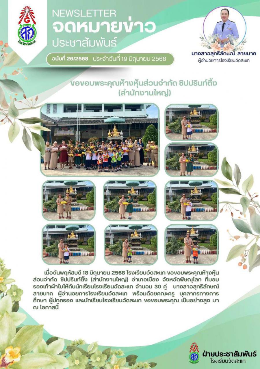 โรงเรียนวัดสะแก สามโคก ปทุมธานี ขอขอบพระคุณห้างหุ้นส่วนจำกัด ซิปปรินท์ติ้ง (สำนักงานใหญ่) อำเภอเมือง จังหวัดปทุมธานี ที่มอบรองเท้านักเรียนจำนวน 30 คู่ ให้กับนักเรียนของโรงเรียนวัดสะแก เมื่อวันที่ 18 มิถุนายน 2568 โดยมีนางสาวสุทธิลักษณ์ สายมาก ผู้อำนวยการโรงเรียนวัดสะแก คณะครู บุคลากรทางการศึกษา ผู้ปกครอง และนักเรียน ร่วมแสดงความขอบคุณอย่างอบอุ่นในโอกาสนี้