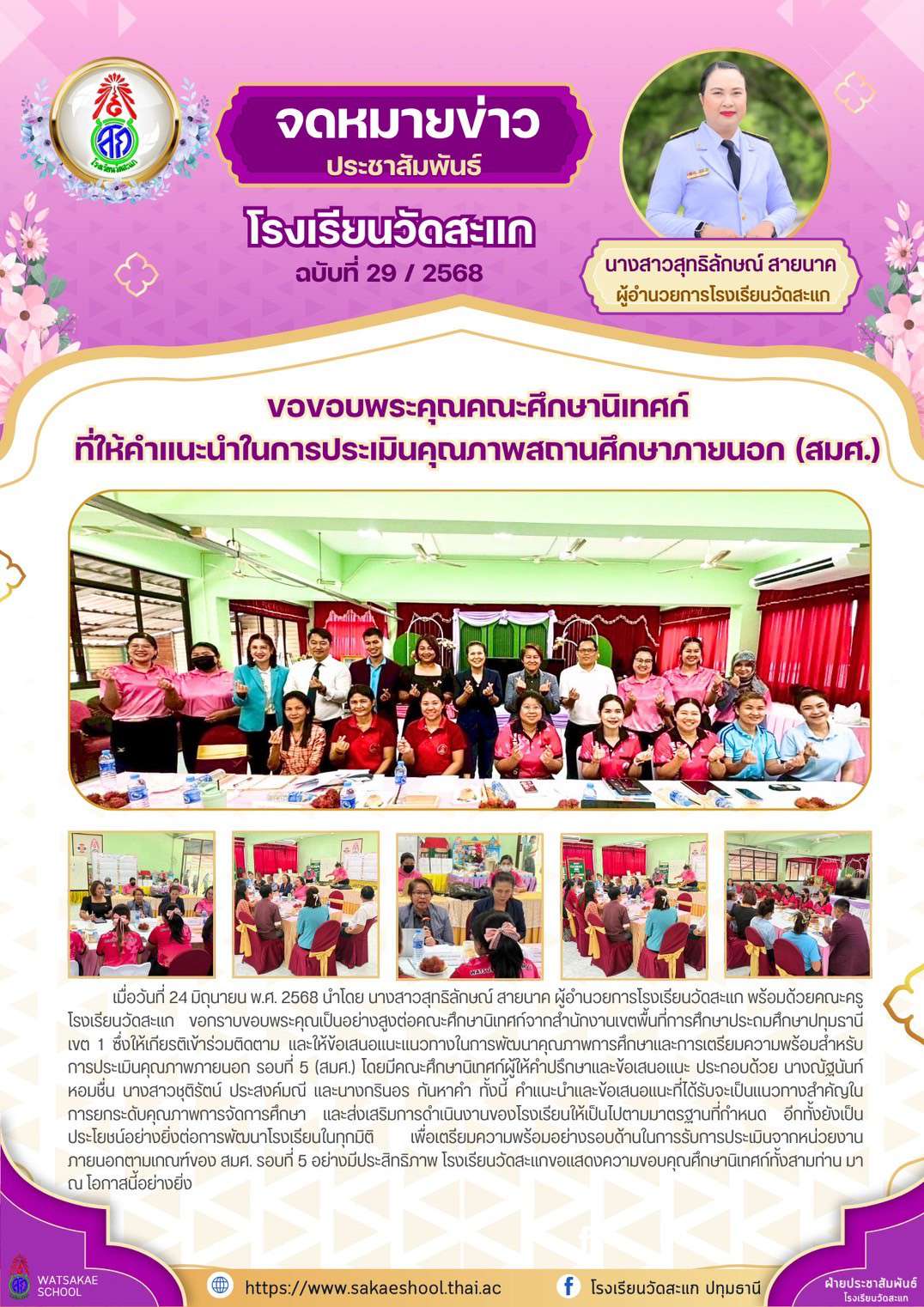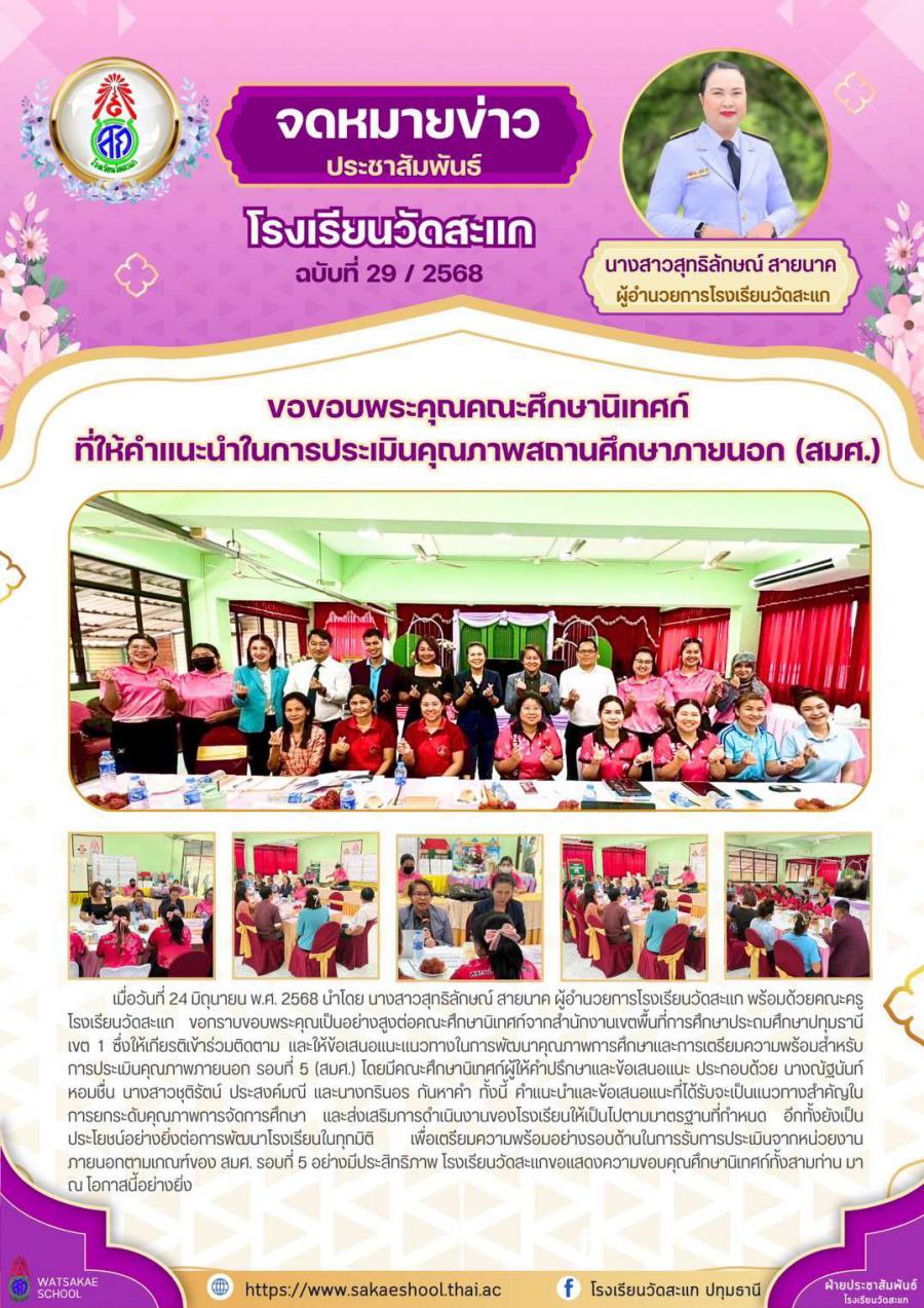 โรงเรียนวัดสะแก สามโคก ปทุมธานี ขอขอบพระคุณคณะศึกษานิเทศก์จากสำนักงานเขตพื้นที่การศึกษาประถมศึกษาปทุมธานี เขต 1 ที่ได้ให้เกียรติเข้ามาให้คำแนะนำ แนวทาง และข้อเสนอแนะในการเตรียมความพร้อมสำหรับการประเมินคุณภาพภายนอก เพื่อพัฒนาและยกระดับคุณภาพการศึกษาของโรงเรียนให้ดียิ่งขึ้น ทางโรงเรียนขอขอบพระคุณมา ณ โอกาสนี้