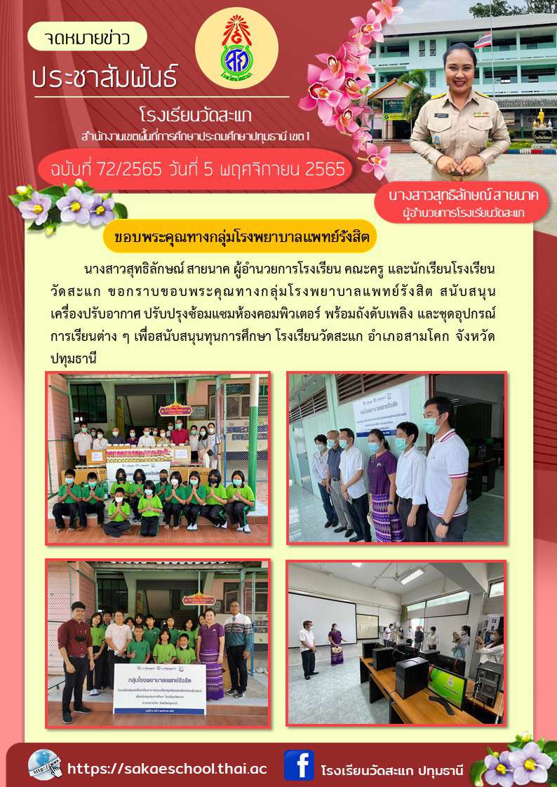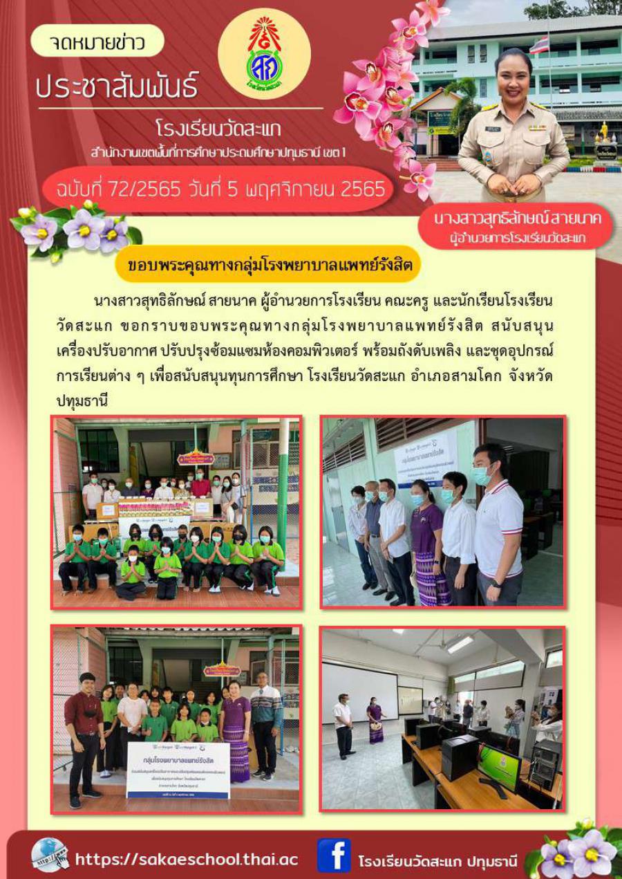 นางสาวสุทธิลักษณ์ สายนาค ผู้อำนวยการโรงเรียน คณะครู และนักเรียนโรงเรียนวัดสะแก ขอกราบขอบพระคุณทางกลุ่มโรงพยาบาลแพทย์รังสิต สนับสนุนเครื่องปรับอากาศ ปรับปรุงซ้อมแซมห้องคอมพิวเตอร์ พร้อมถังดับเพลิง และชุดอุปกรณ์การเรียนต่าง ๆ เพื่อสนับสนุนทุนการศึกษา โรงเรียนวัดสะแก อำเภอสามโคก จังหวัดปทุมธานี