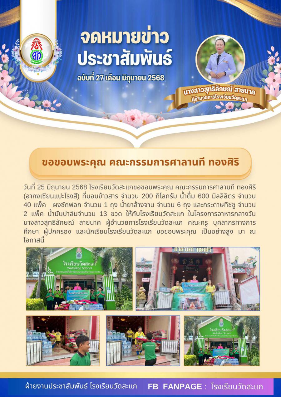 โรงเรียนวัดสะแก สามโคก ปทุมธานี ขอขอบพระคุณคณะกรรมการศาลานที ทองศิริ (อาจารย์เซียนแปะโรงสี) ที่มอบข้าวสาร น้ำดื่ม น้ำยาล้างจาน ผงซักฟอก และของใช้จำเป็นหลายรายการ เพื่อสนับสนุนโครงการอาหารกลางวันของโรงเรียน เมื่อวันที่ 25 มิถุนายน 2568 โดยมีนางสาวสุทธิลักษณ์ สายมาก ผู้อำนวยการโรงเรียนวัดสะแก พร้อมด้วยคณะครู บุคลากรทางการศึกษา ผู้ปกครอง และนักเรียน ร่วมรับมอบและแสดงความขอบพระคุณมา ณ โอกาสนี้