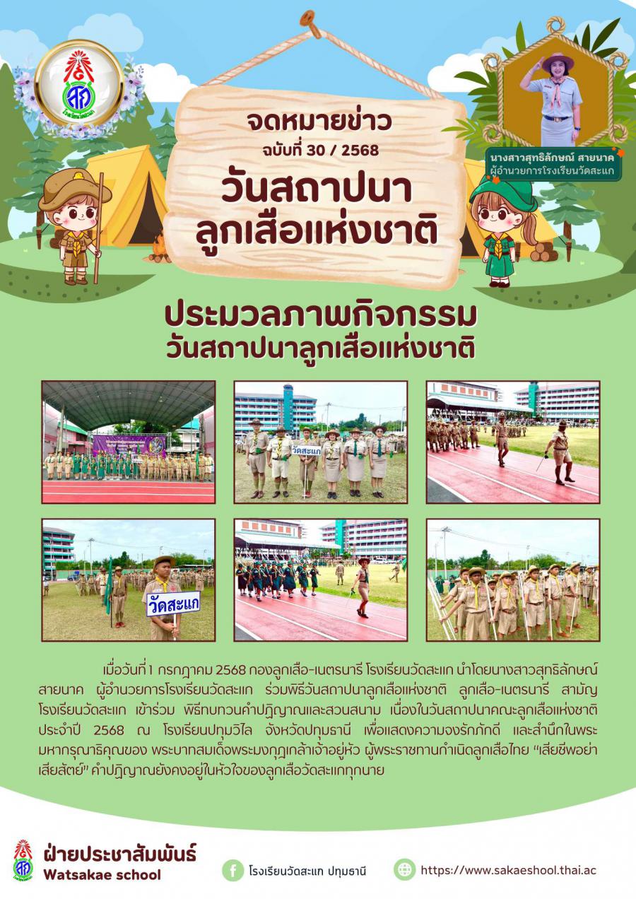 โรงเรียนวัดสะแก นำโดยผู้บังคับบัญชาลูกเสือและลูกเสือ-เนตรนารี เข้าร่วมพิธีทบทวนคำปฏิญาณและสวนสนาม เนื่องในวันสถาปนาลูกเสือแห่งชาติ ประจำปี 2568 ณ โรงเรียนปทุมวิไล จังหวัดปทุมธานี เพื่อรำลึกถึงพระมหากรุณาธิคุณของพระบาทสมเด็จพระมงกุฎเกล้าเจ้าอยู่หัว ผู้พระราชทานกำเนิดลูกเสือไทย และเพื่อส่งเสริมความมีระเบียบวินัย ความเสียสละ และความสามัคคีในหมู่ลูกเสือ