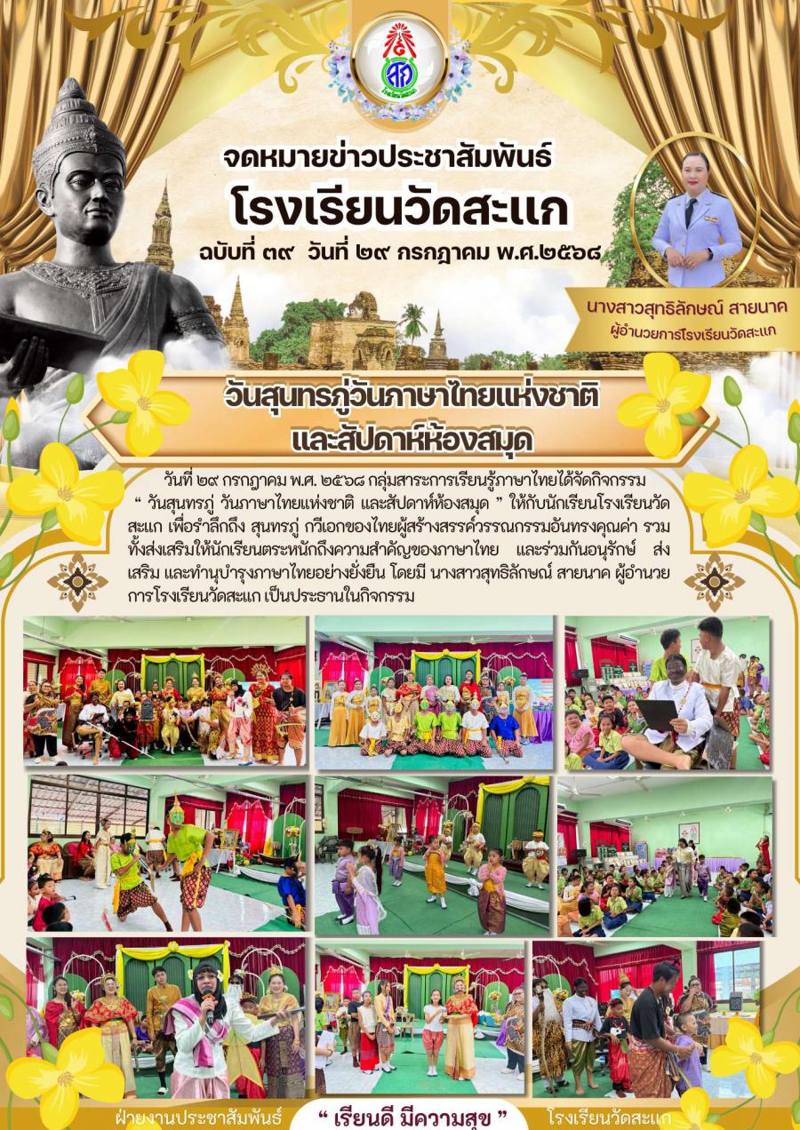 “ วันสุนทรภู่ วันภาษาไทยแห่งชาติ และสัปดาห์ห้องสมุด ” ให้กับนักเรียนโรงเรียนวัดสะแก เพื่อรำลึกถึง สุนทรภู่ กวีเอกของไทยผู้สร้างสรรค์วรรณกรรมอันทรงคุณค่า รวมทั้งส่งเสริมให้นักเรียนตระหนักถึงความสำคัญของภาษาไทย และร่วมกันอนุรักษ์ ส่งเสริม และทำนุบำรุงภาษาไทยอย่างยั่งยืน โดยมี นางสาวสุทธิลักษณ์ สายนาค ผู้อำนวยการโรงเรียนวัดสะแก เป็นประธานในกิจกรรม?????https://static.xx.fbcdn.net/images/emoji.php/v9/tdd/1/16/270d_1f3fb.png" style="border-radius:0px; border:0px; height:16px; object-fit:fill; width:16px" />????https://static.xx.fbcdn.net/images/emoji.php/v9/t28/1/16/1f3eb.png" style="border-radius:0px; border:0px; height:16px; object-fit:fill; width:16px" />