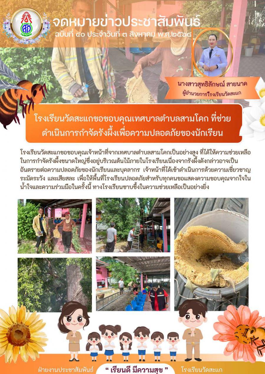 ????????https://static.xx.fbcdn.net/images/emoji.php/v9/tfb/1/16/1f64f_1f3fb.png" style="border-radius:0px; border:0px; height:16px; object-fit:fill; width:16px" />????https://static.xx.fbcdn.net/images/emoji.php/v9/t1f/1/16/1f41d.png" style="border-radius:0px; border:0px; height:16px; object-fit:fill; width:16px" />โรงเรียนวัดสะแกขอขอบคุณ เจ้าหน้าที่จากเทศบาลตำบลสามโคกเป็นอย่างสูง ที่ได้ให้ความช่วยเหลือในการกำจัดรังผึ้งขนาดใหญ่ซึ่งอยู่บริเวณต้นไม้ภายในโรงเรียนเนื่องจากรังผึ้งดังกล่าวอาจเป็นอันตรายต่อความปลอดภัยของนักเรียนและบุคลากร เจ้าหน้าที่ได้เข้าดำเนินการด้วยความเชี่ยวชาญ ระมัดระวัง และเสียสละ เพื่อให้พื้นที่โรงเรียนปลอดภัยสำหรับทุกคนขอแสดงความขอบคุณจากใจในน้ำใจและความร่วมมือในครั้งนี้ ทางโรงเรียนซาบซึ้งในความช่วยเหลือเป็นอย่างยิ่ง????????https://static.xx.fbcdn.net/images/emoji.php/v9/t48/1/16/1f467_1f3fb.png" style="border-radius:0px; border:0px; height:16px; object-fit:fill; width:16px" />????????https://static.xx.fbcdn.net/images/emoji.php/v9/te6/1/16/1f476_1f3fb.png" style="border-radius:0px; border:0px; height:16px; object-fit:fill; width:16px" />?https://static.xx.fbcdn.net/images/emoji.php/v9/tf4/1/16/2728.png" style="border-radius:0px; border:0px; height:16px; object-fit:fill; width:16px" />