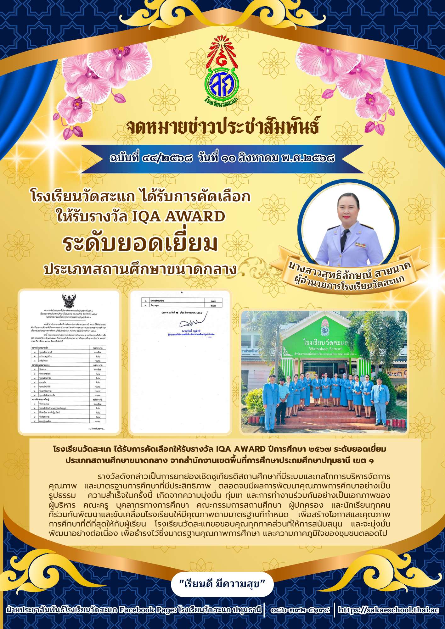 โรงเรียนวัดสะแก ได้รับรางวัล IQA AWARD ระดับยอดเยี่ยม ประเภทสถานศึกษาขนาดกลาง ปีการศึกษา 2567 จากสำนักงานเขตพื้นที่การศึกษาประถมศึกษาปทุมธานี เขต 1